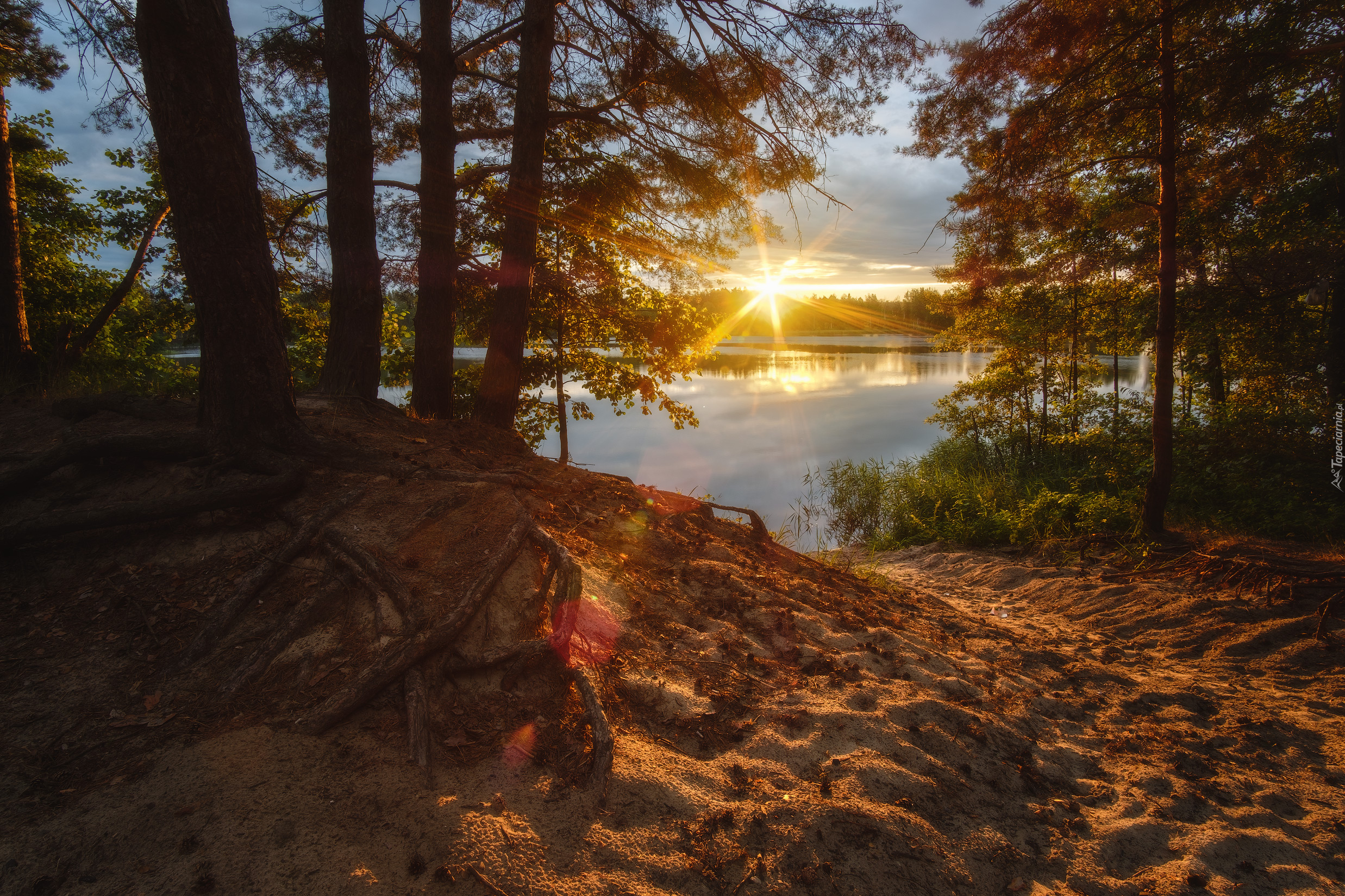 Edytor tapety: Wschód słońca nad leśnym jeziorem