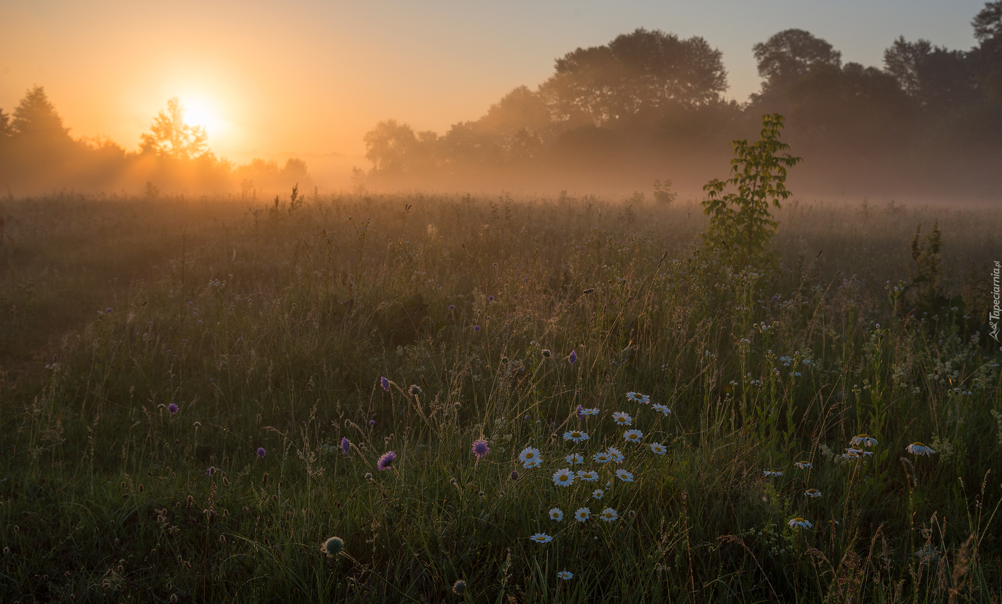 Edytor tapety: Wiosenne kwiaty na łące o poranku