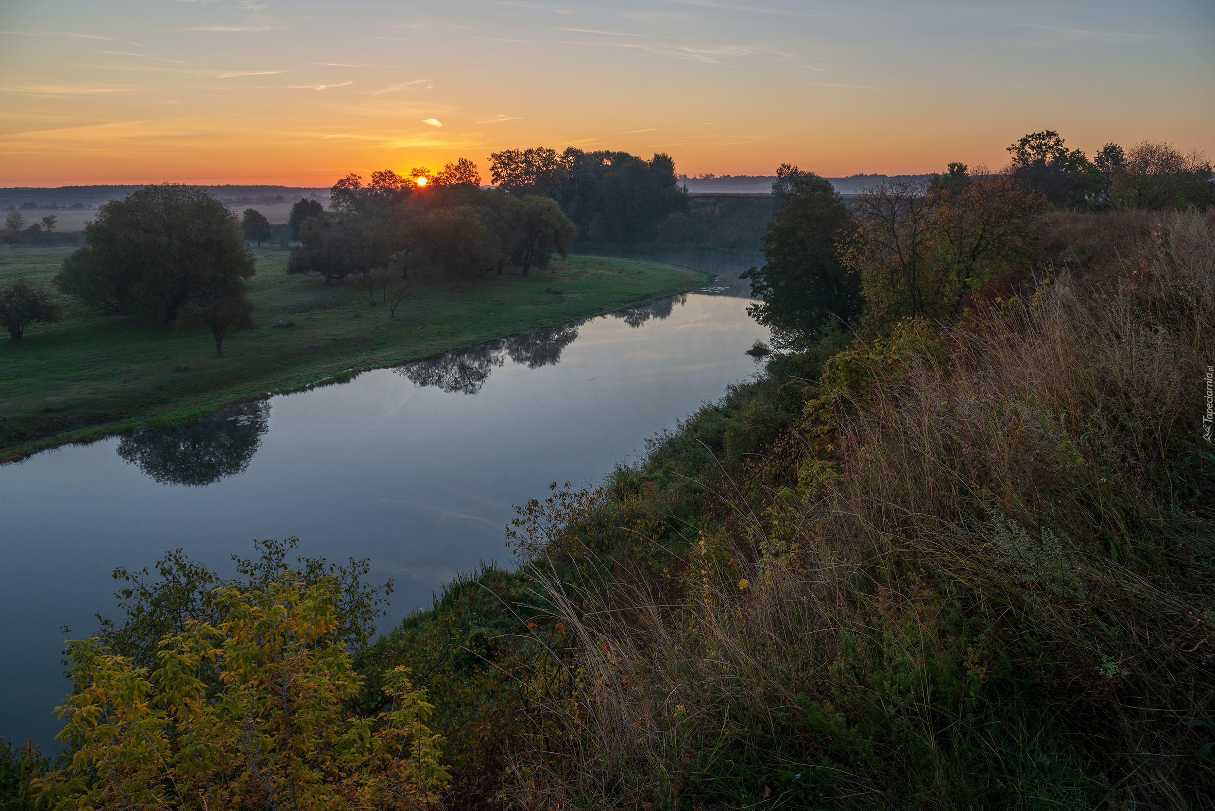 Edytor tapety: Drzewa i trawy nad rzeką o poranku