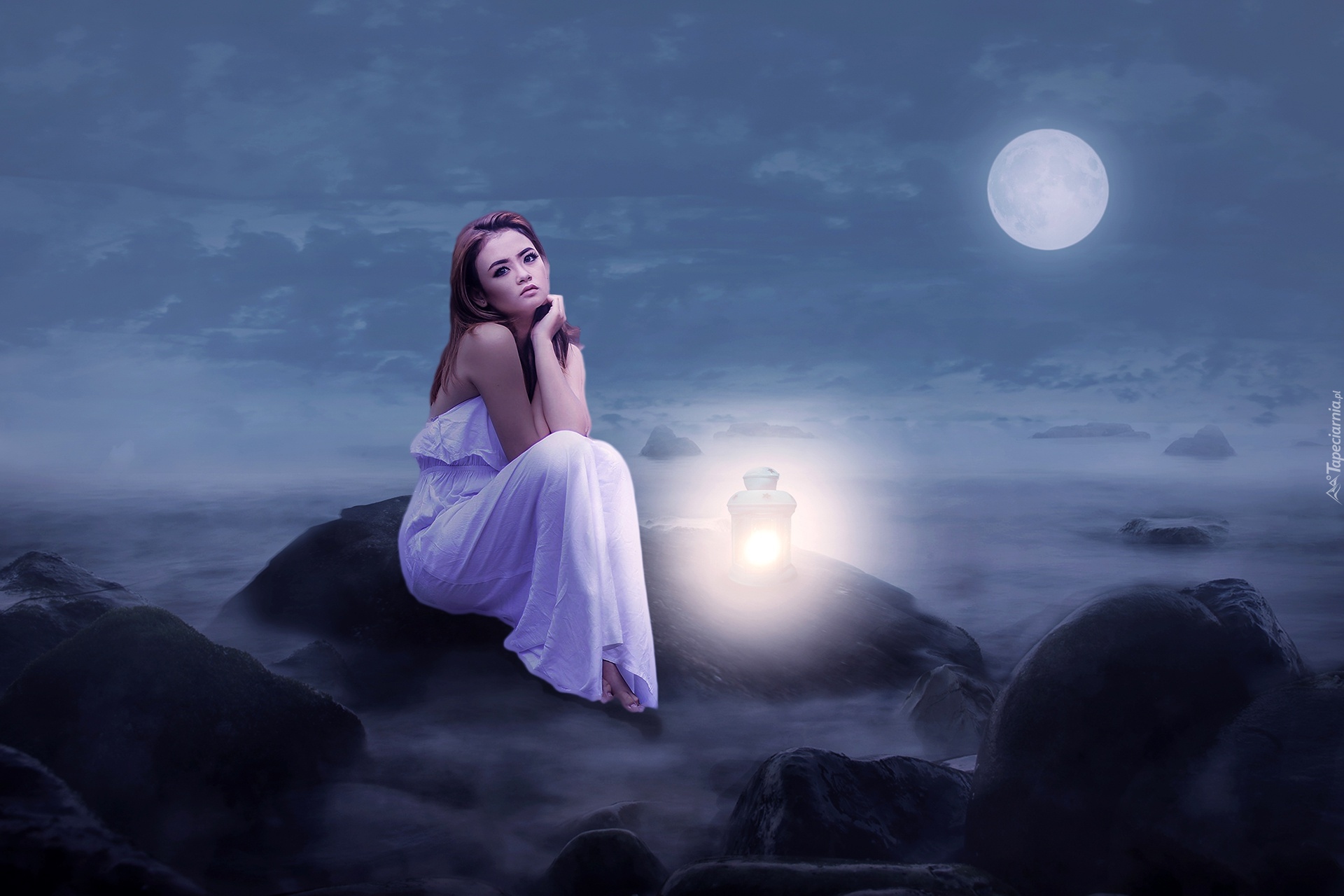 Edytor tapety: Dziewczyna na skale obok świecącej latarenki