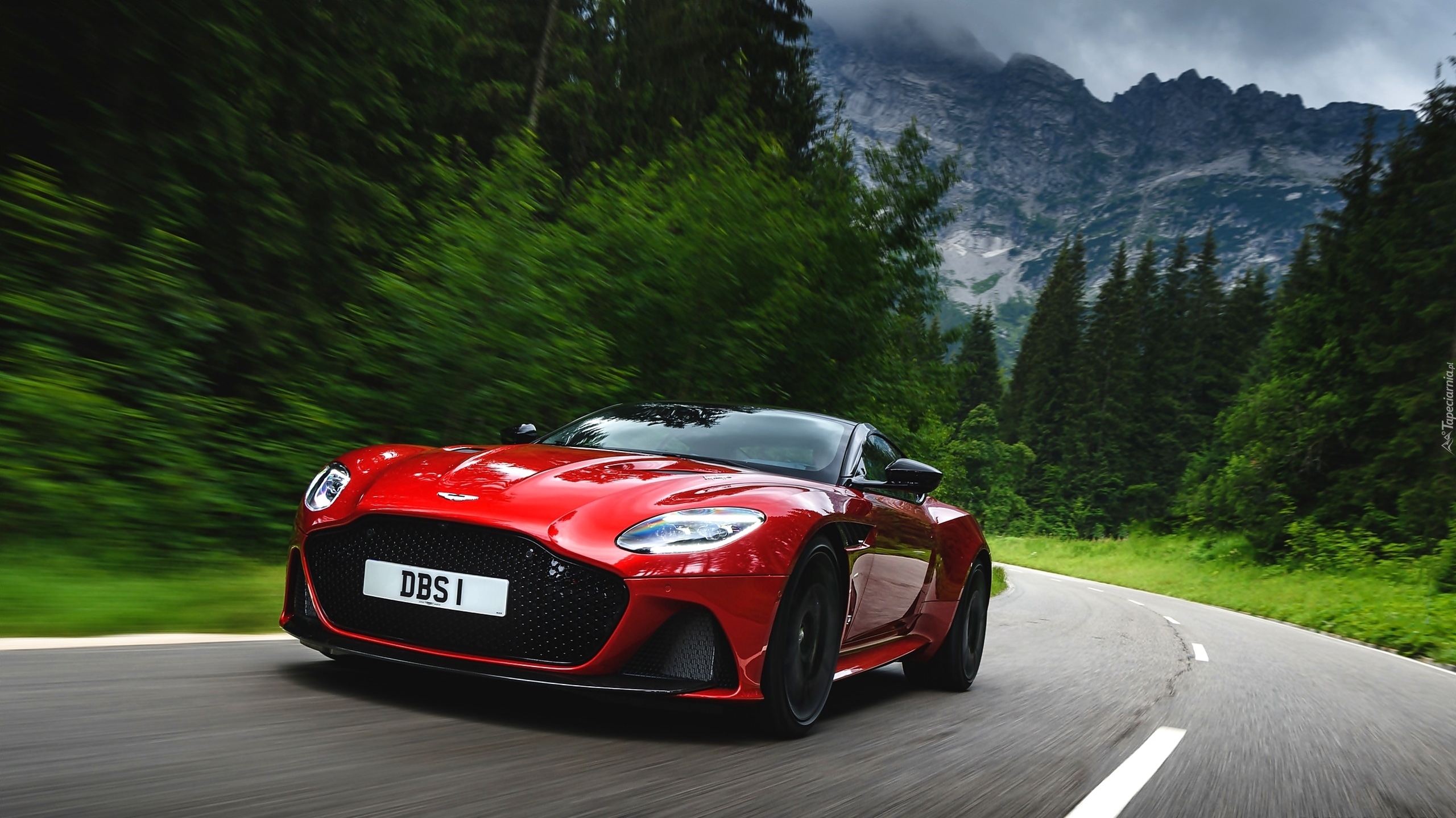 Edytor tapety: Czerwony Aston Martin DBS Superleggera na górskiej drodze