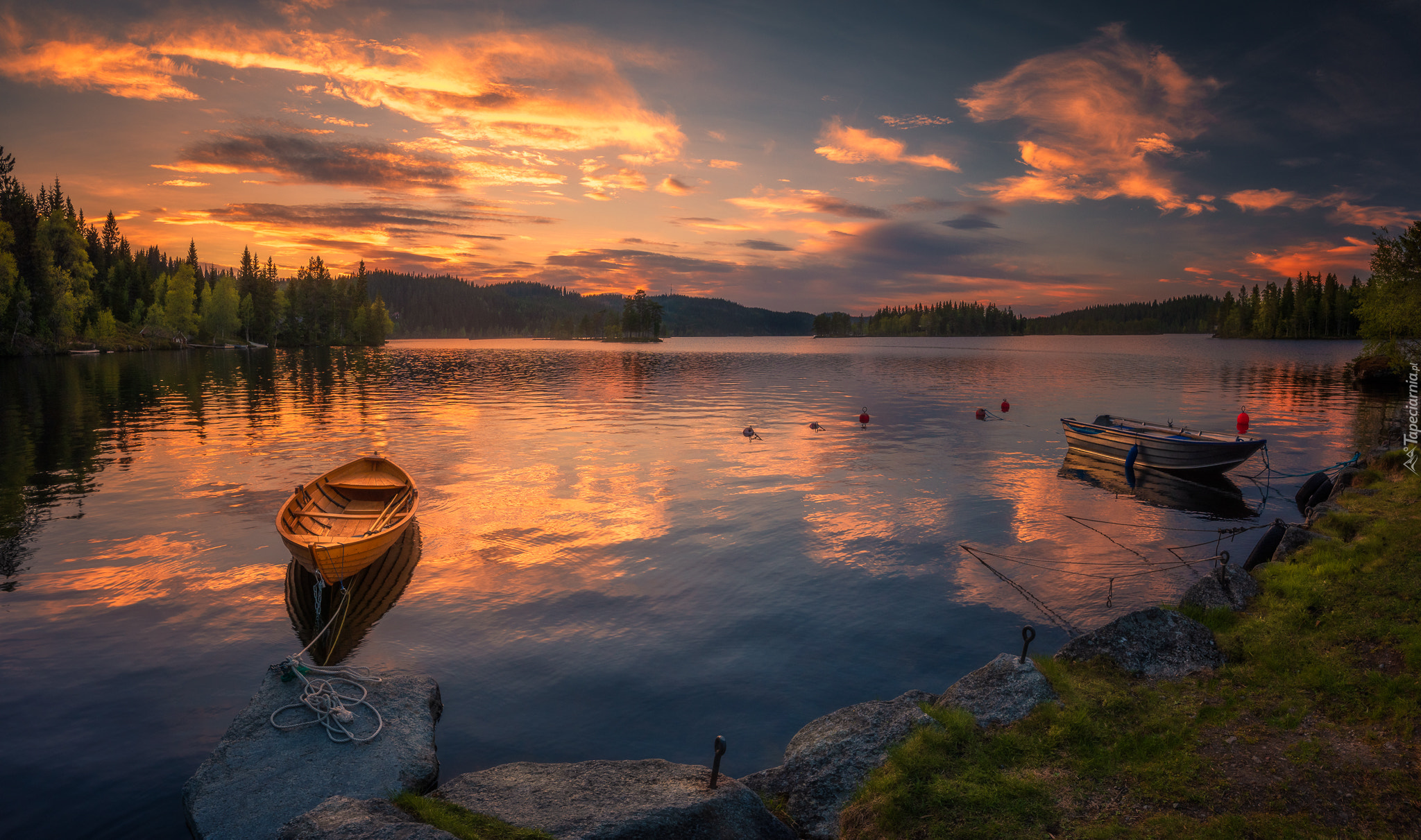 Edytor tapety: Łódki przy brzegu norweskiego jeziora
