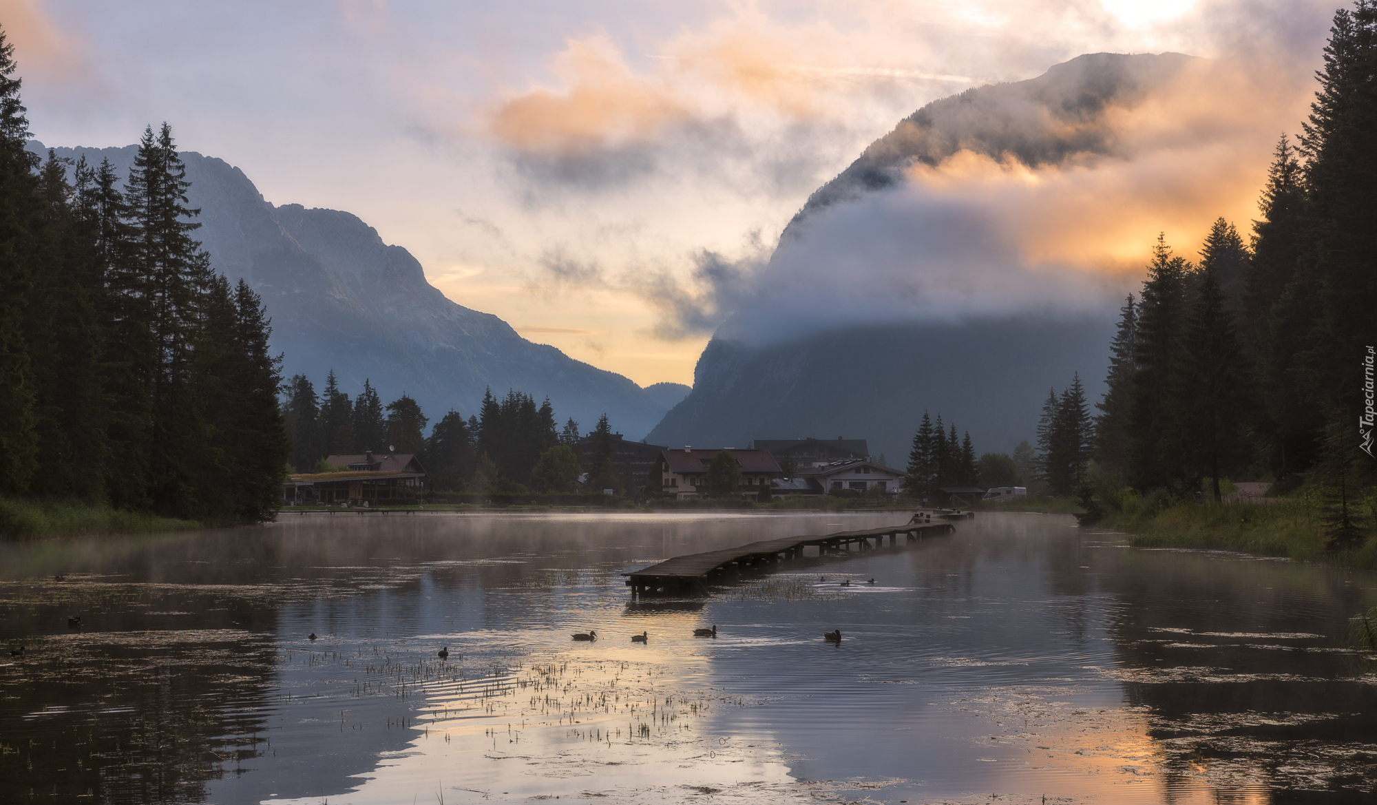 Edytor tapety: Kaczki obok pomostu na górskim jeziorze