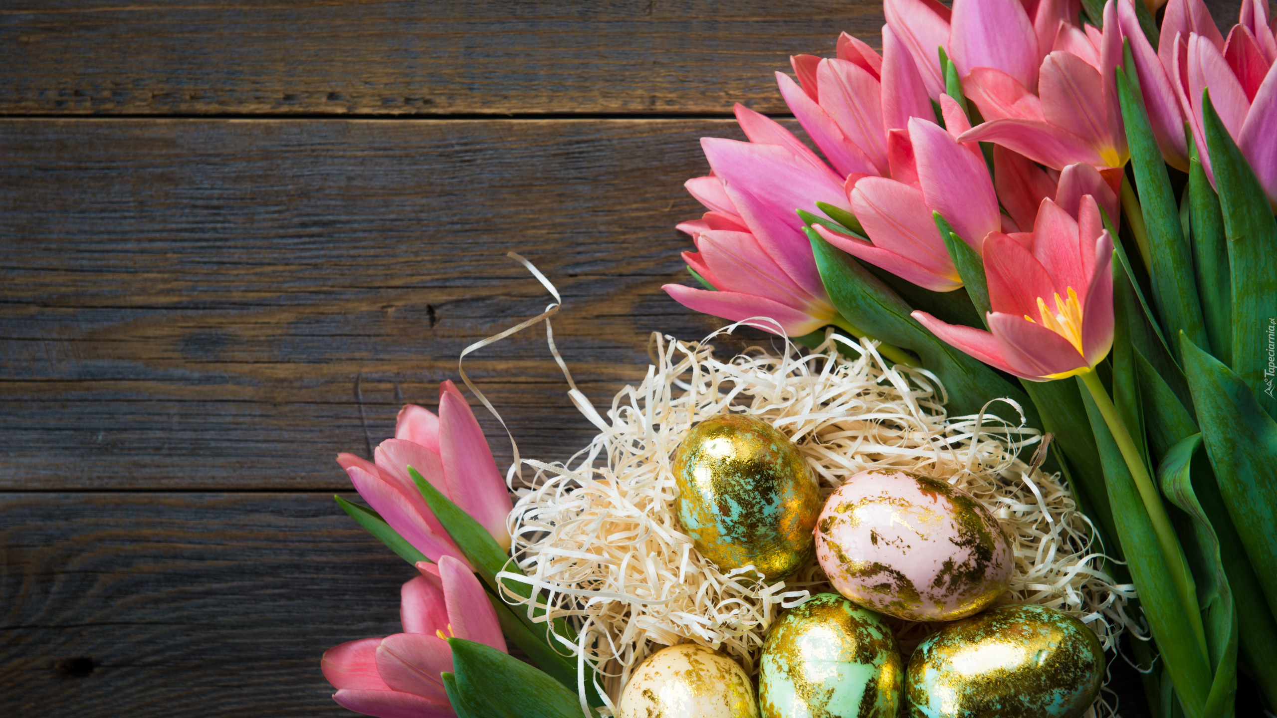 Edytor tapety: Tulipany położone na deskach obok pisanek w gnieździe