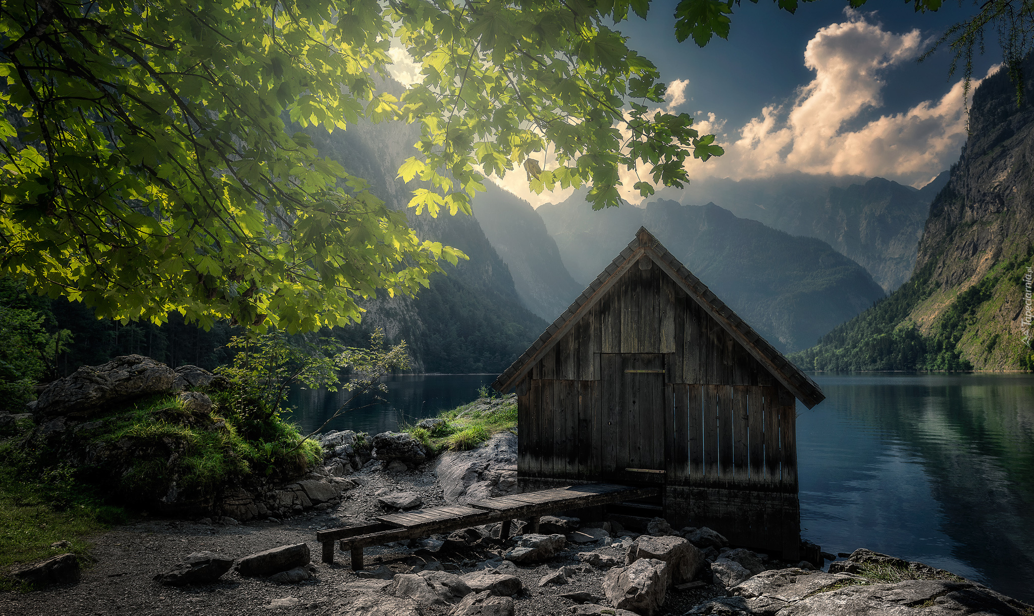 Edytor tapety: Drewniany domek przy brzegu jeziora Konigssee