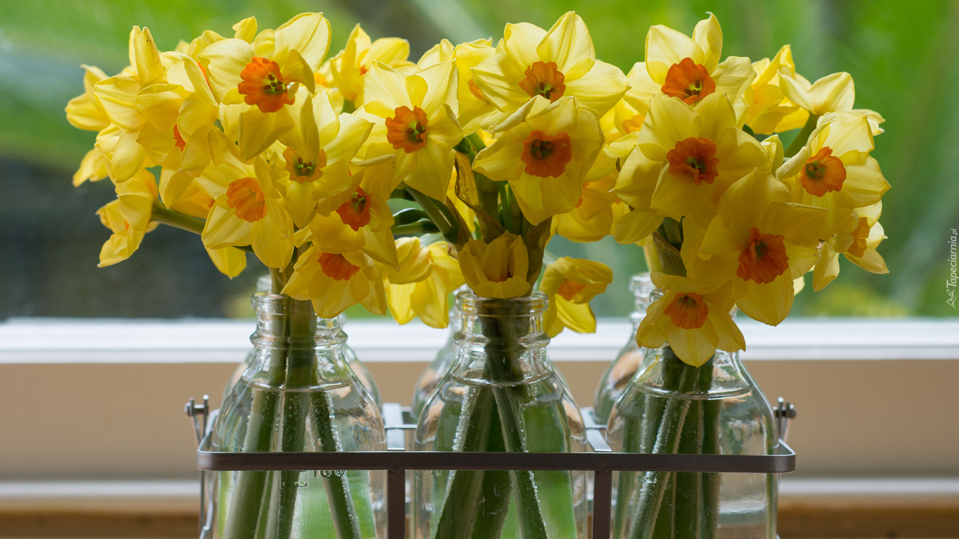 Edytor tapety: Narcyzy żonkile w butelkach