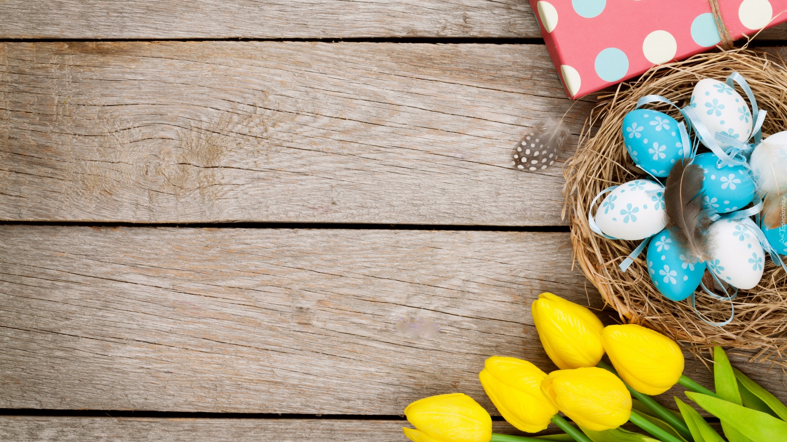 Edytor tapety: Niebiesko-białe pisanki w gnieździe obok tulipanów
