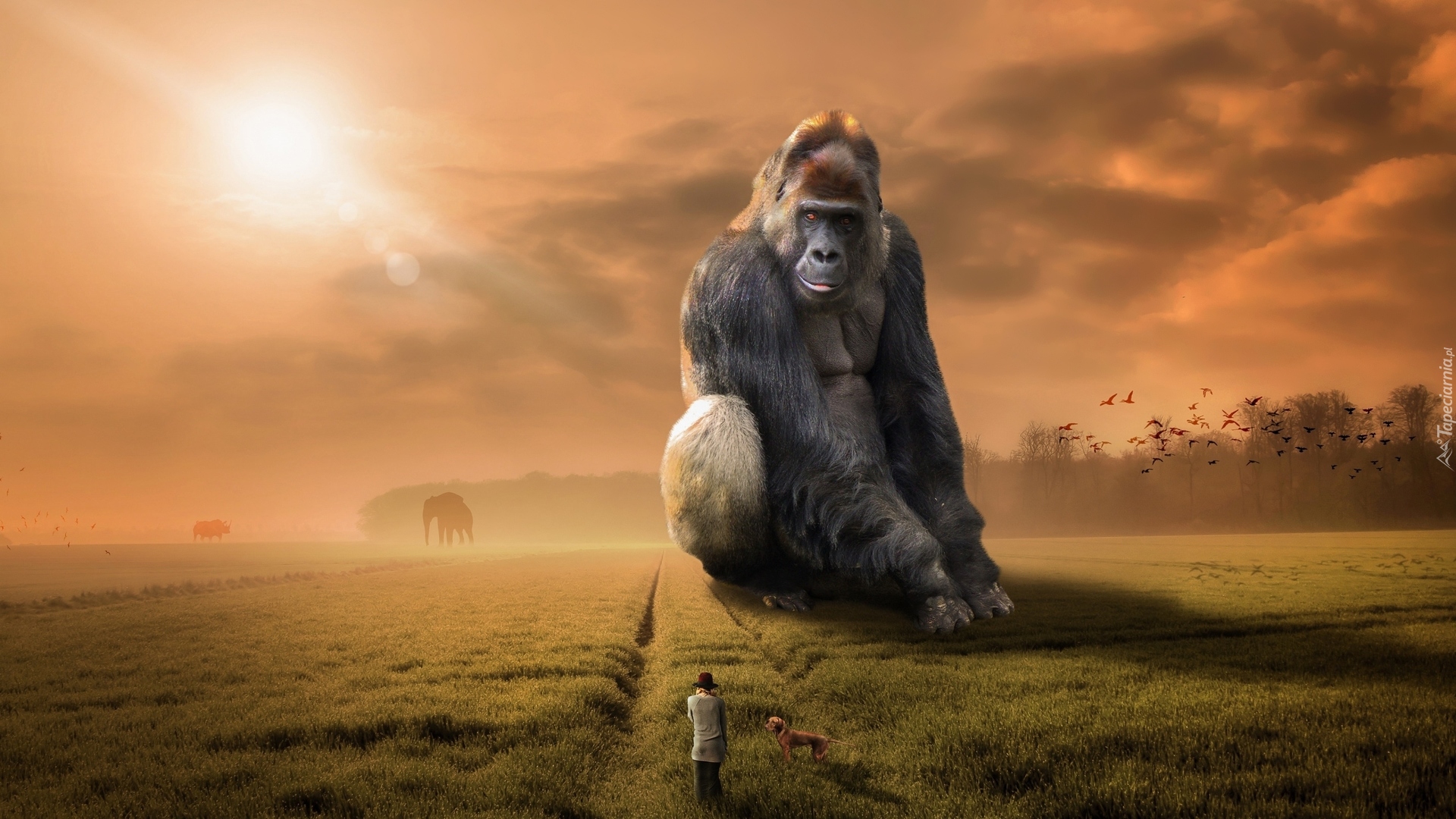 Edytor tapety: Grafika z gorylem spoglądającym na kobietę i psa