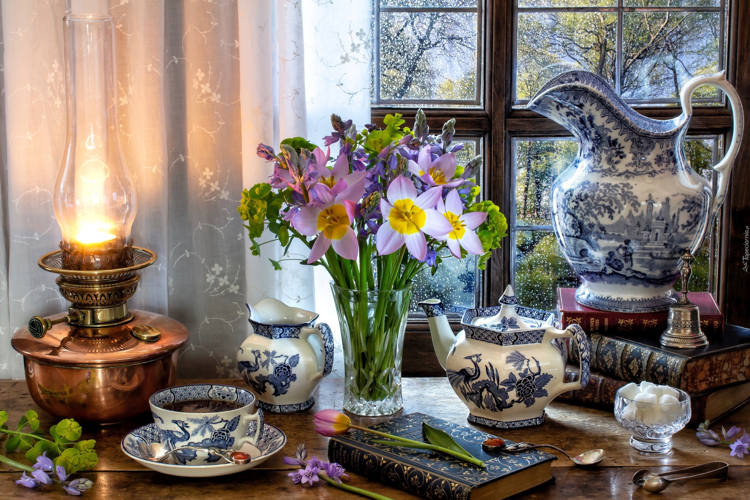 Edytor tapety: Zastawa obok lampy naftowej przy oknie