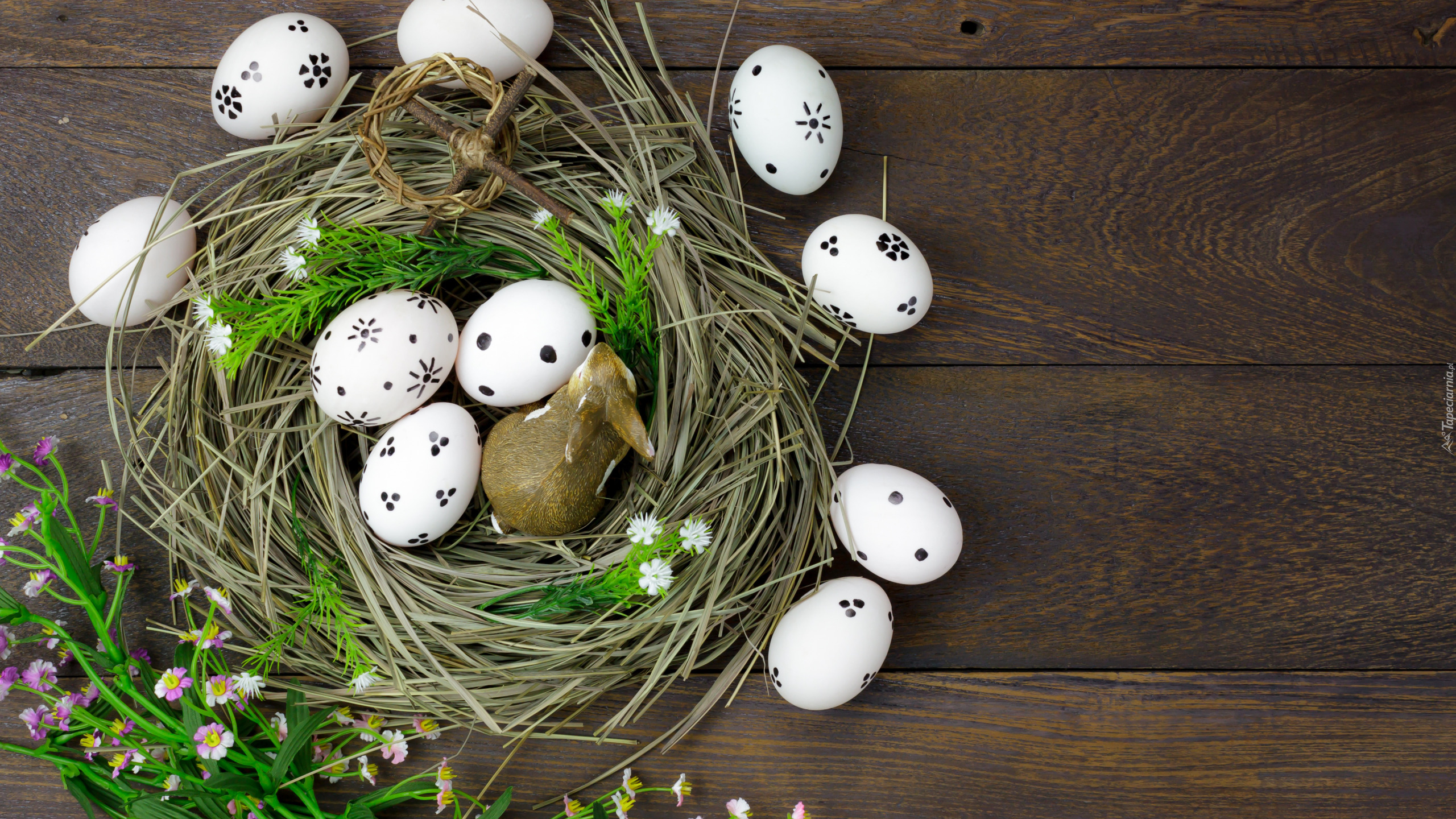 Edytor tapety: Pisanki i zajączek w wianku z trawy