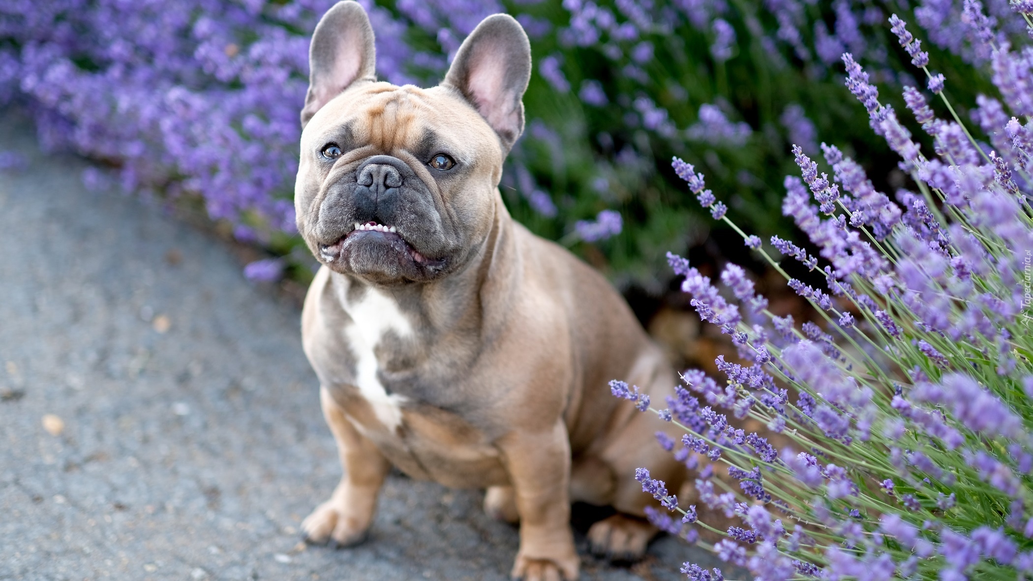 Edytor tapety: Buldog francuski przy kwiatach lawendy