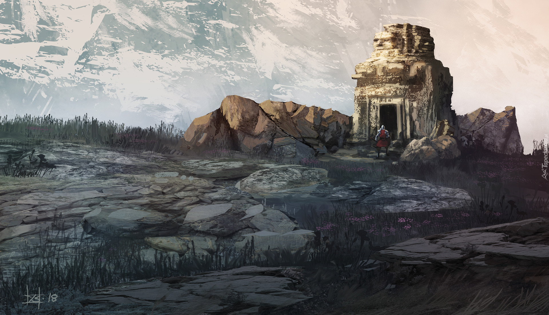 Edytor tapety: Rycerz przed wejściem do budowli przy skałach