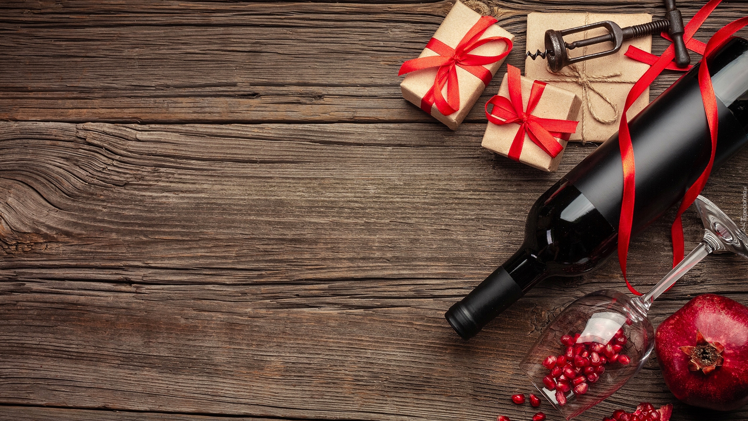 Edytor tapety: Butelka wina obok prezentów i granatu