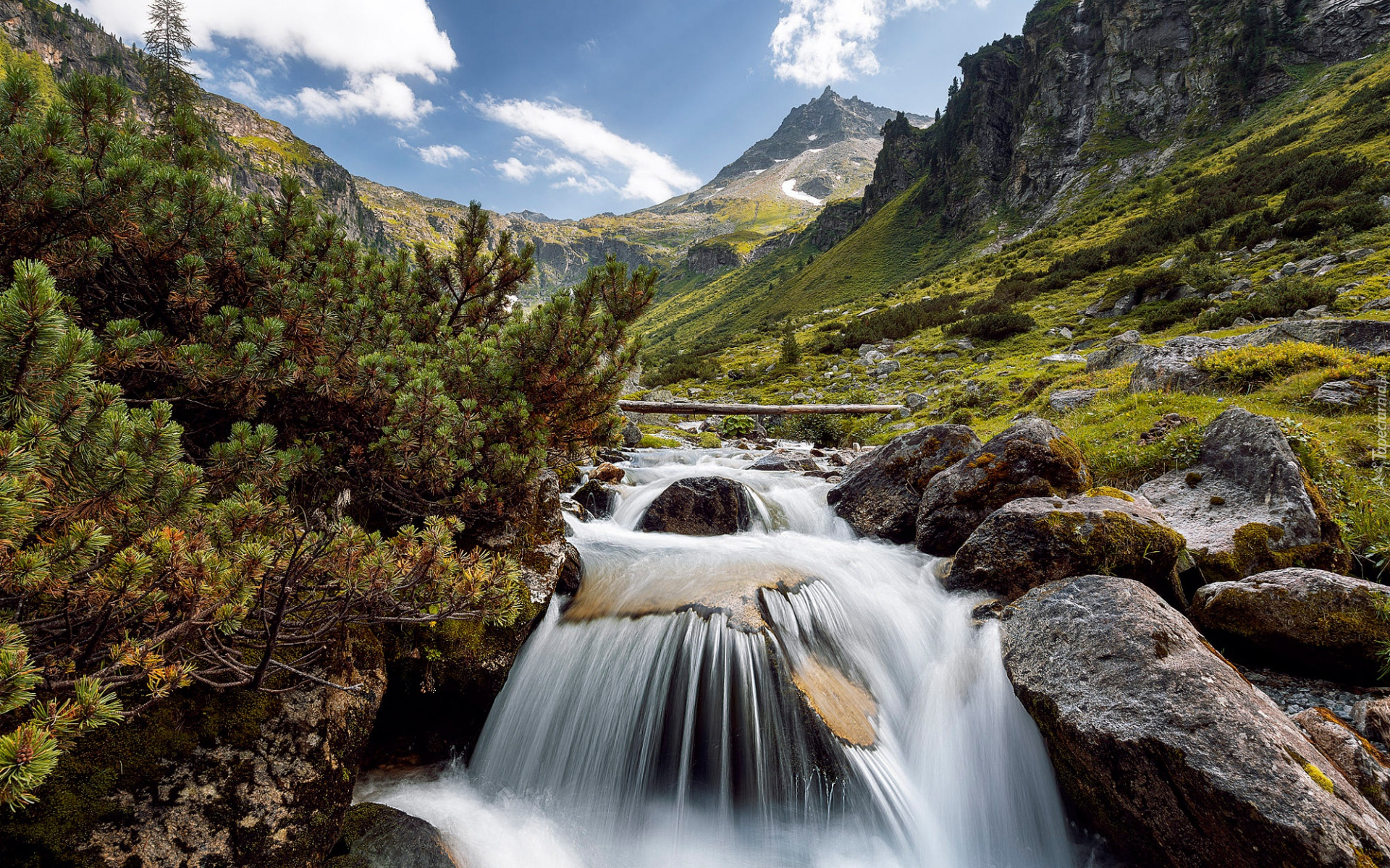 Edytor tapety: Iglaste krzewy nad rzeką w górach