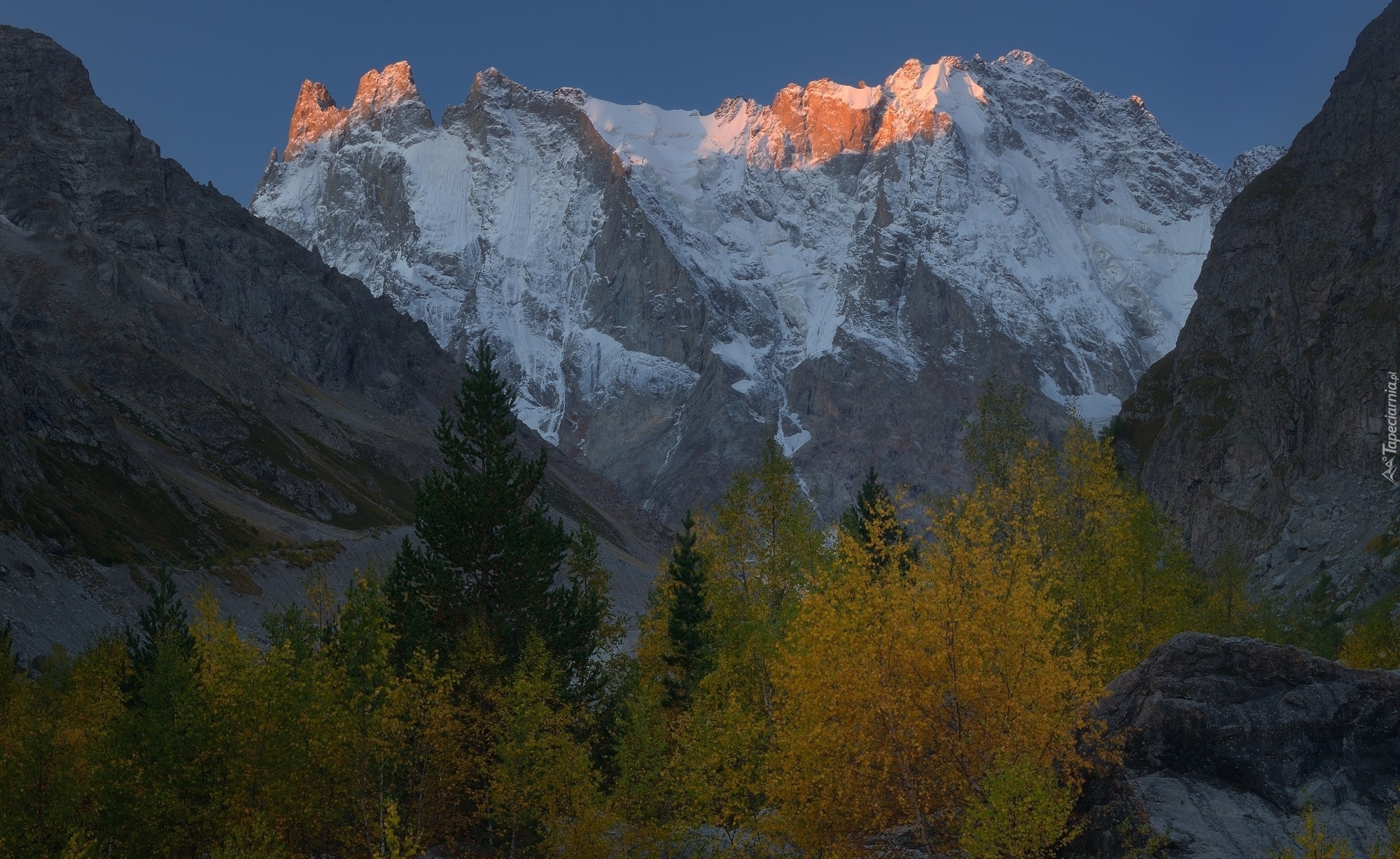 Edytor tapety: Drzewa przy ośnieżonych górach