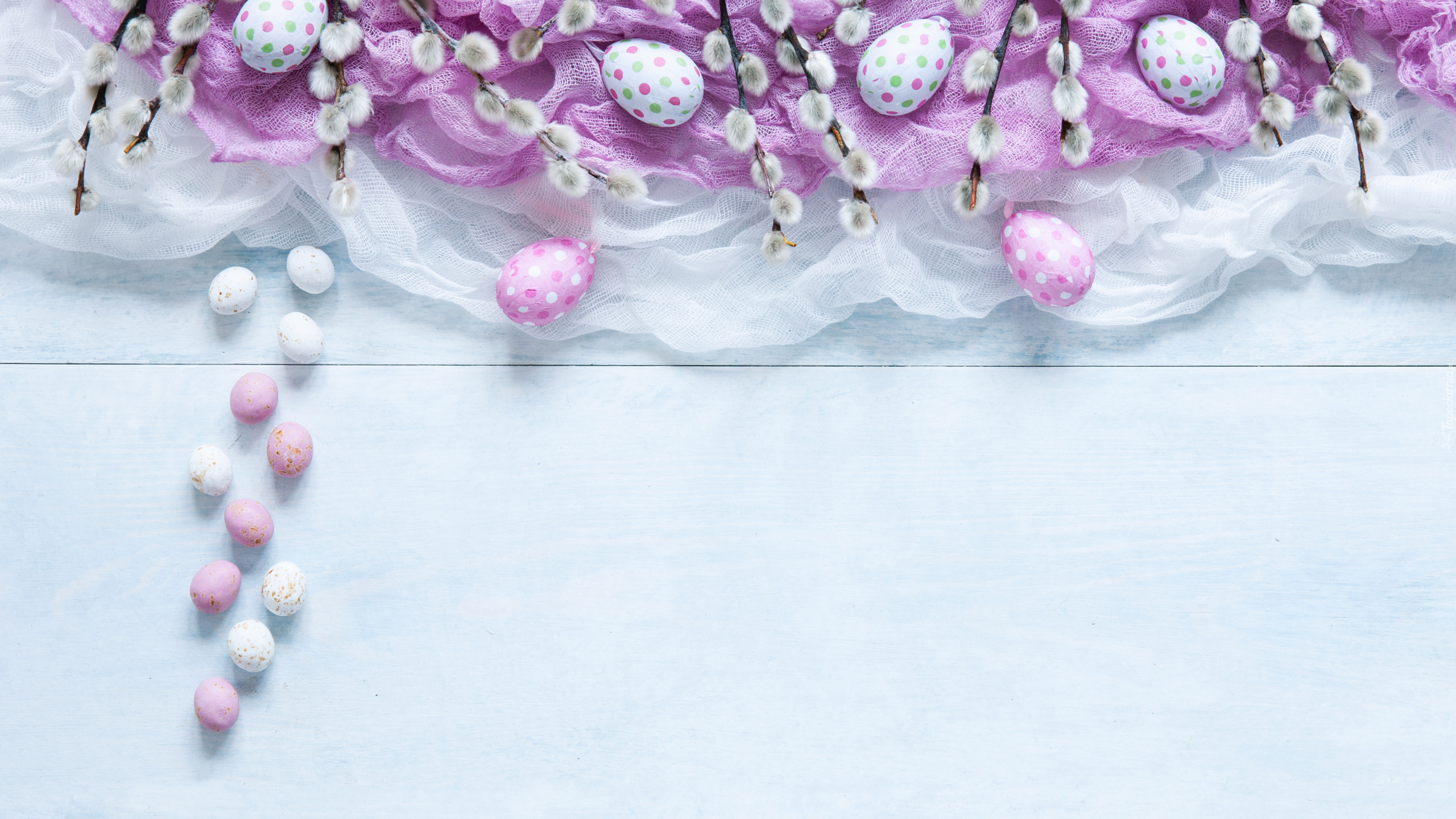 Edytor tapety: Pisanki i bazie na różowym materiale