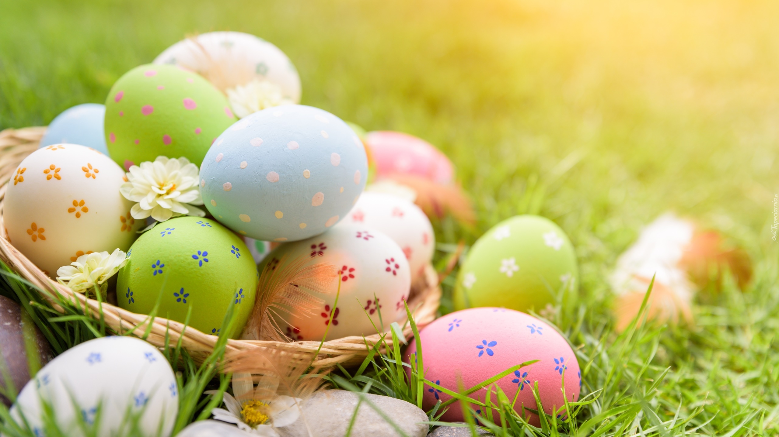 Edytor tapety: Koszyk z pisankami na trawie
