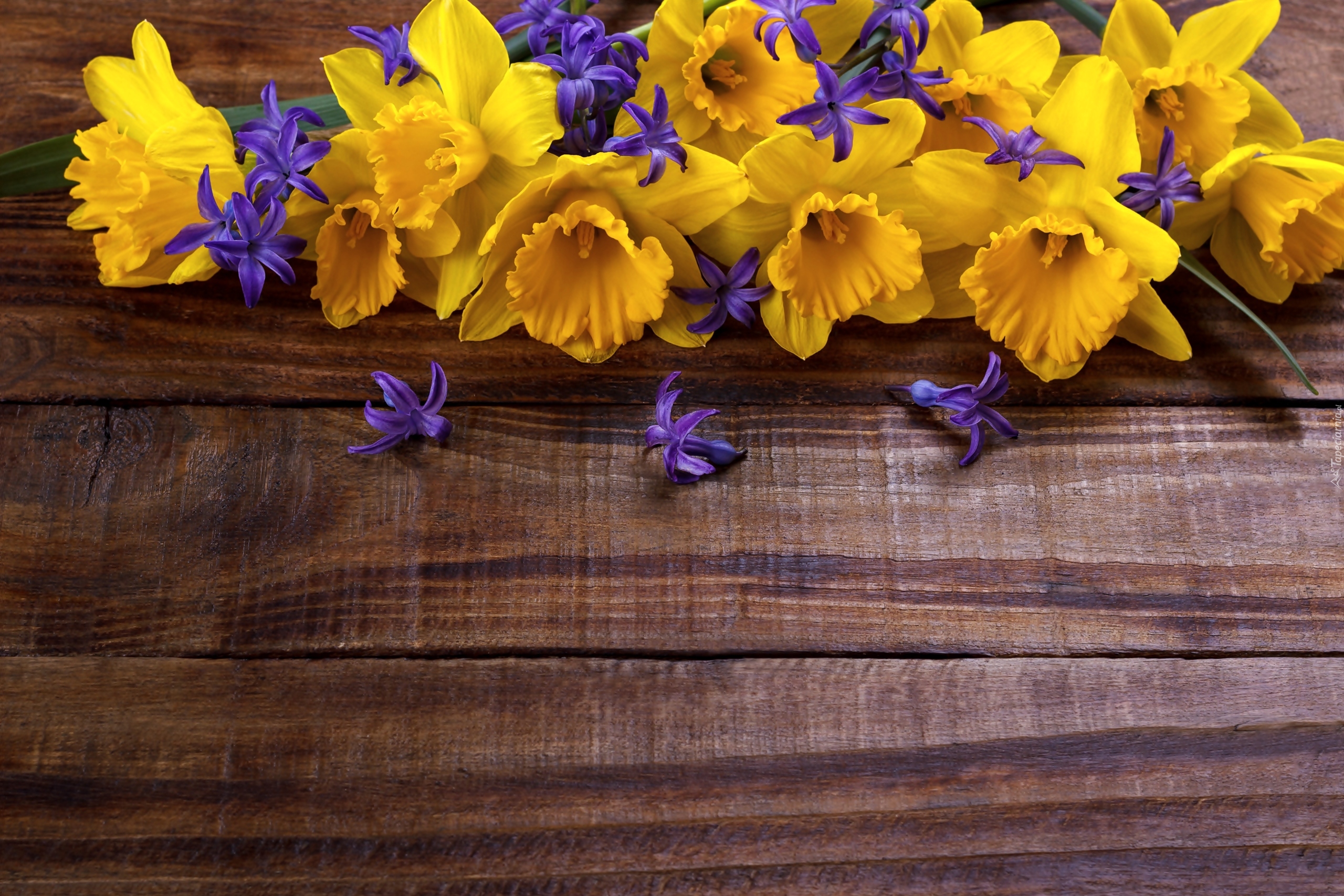 Edytor tapety: Fioletowe kwiatki pomiędzy żonkilami