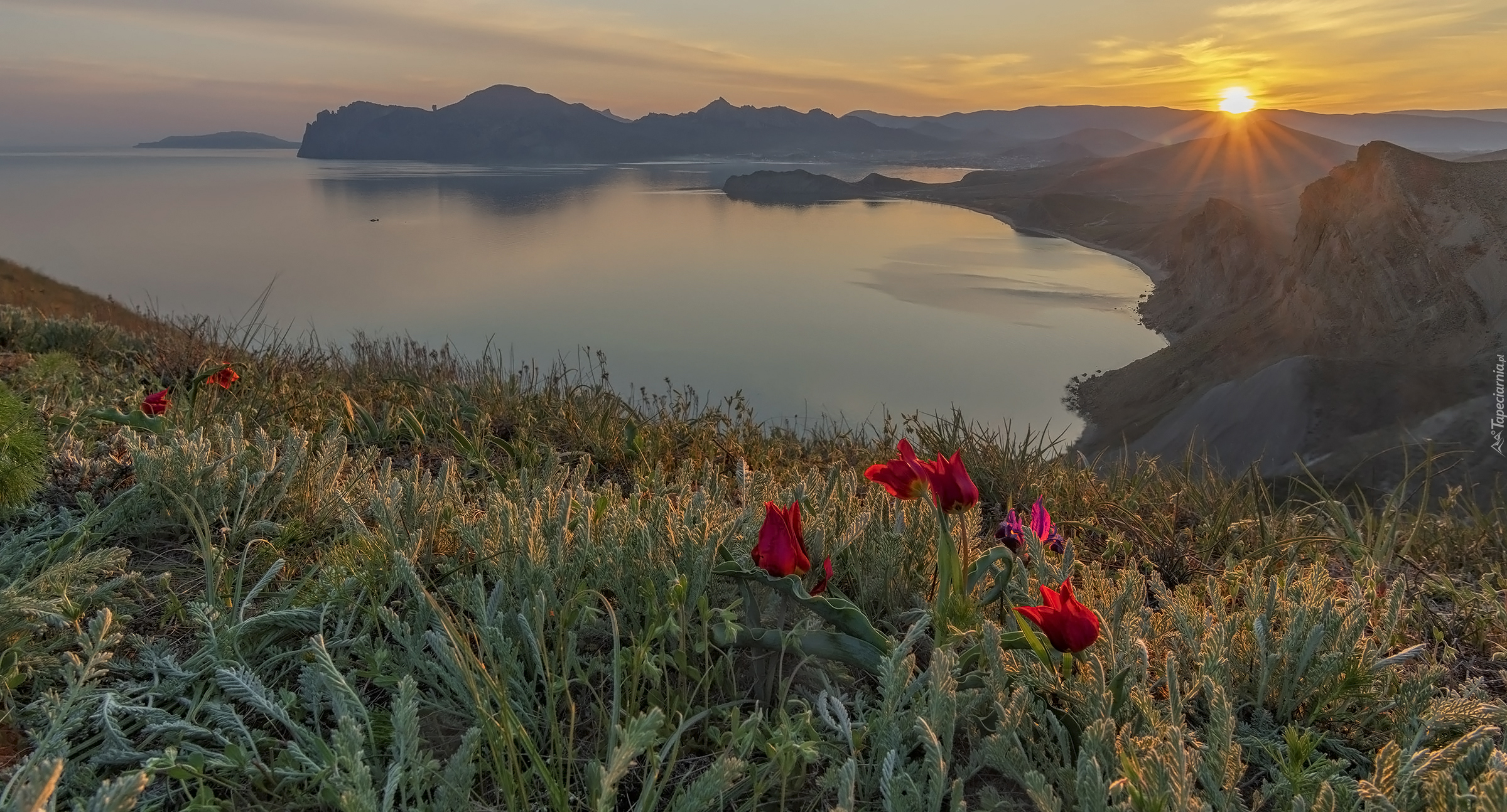 Edytor tapety: Tulipany na wzgórzu i góry nad morzem Czarnym