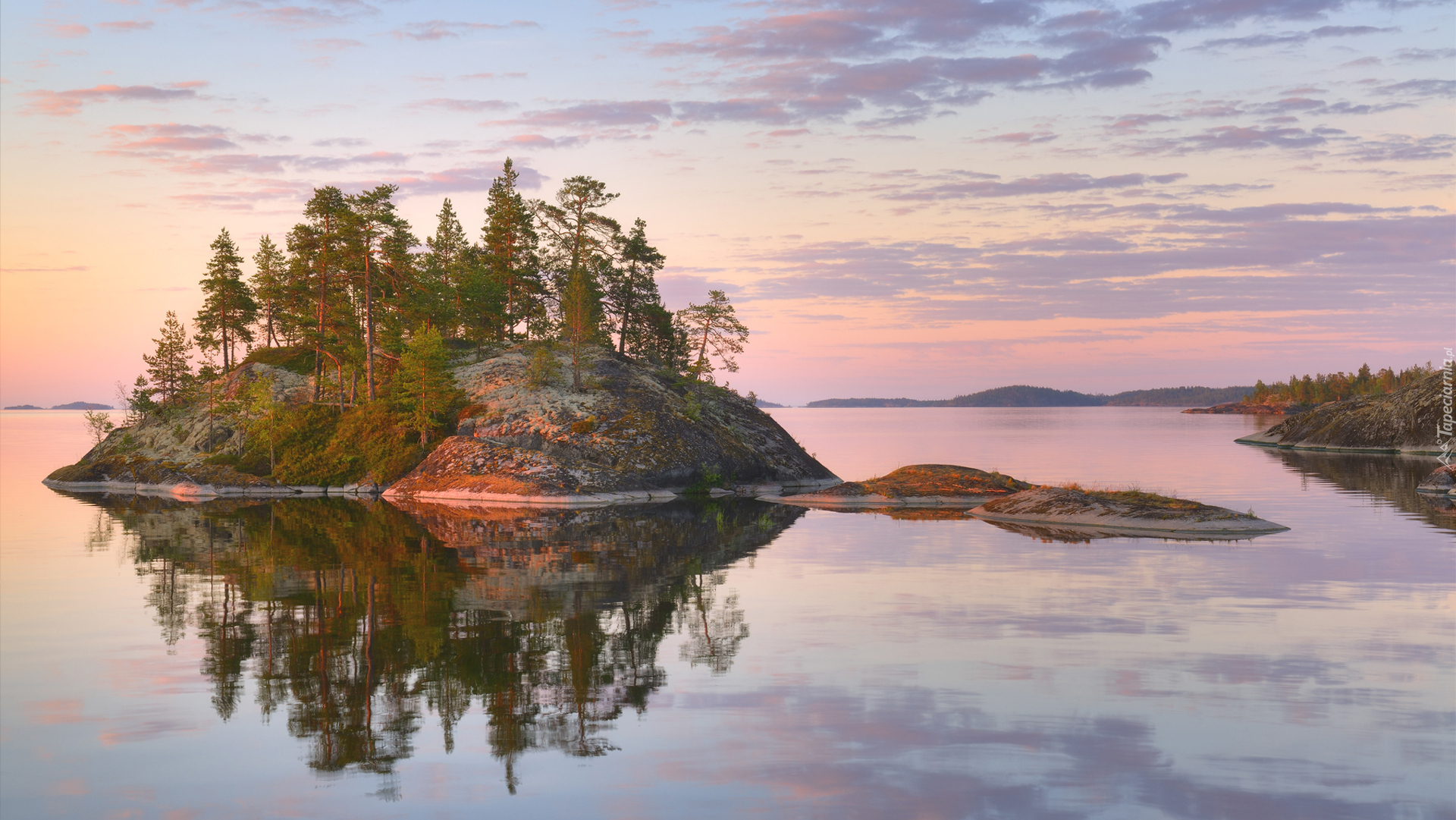 Edytor tapety: Wysepka porośnięta drzewami na jeziorze Ładoga w Rosji