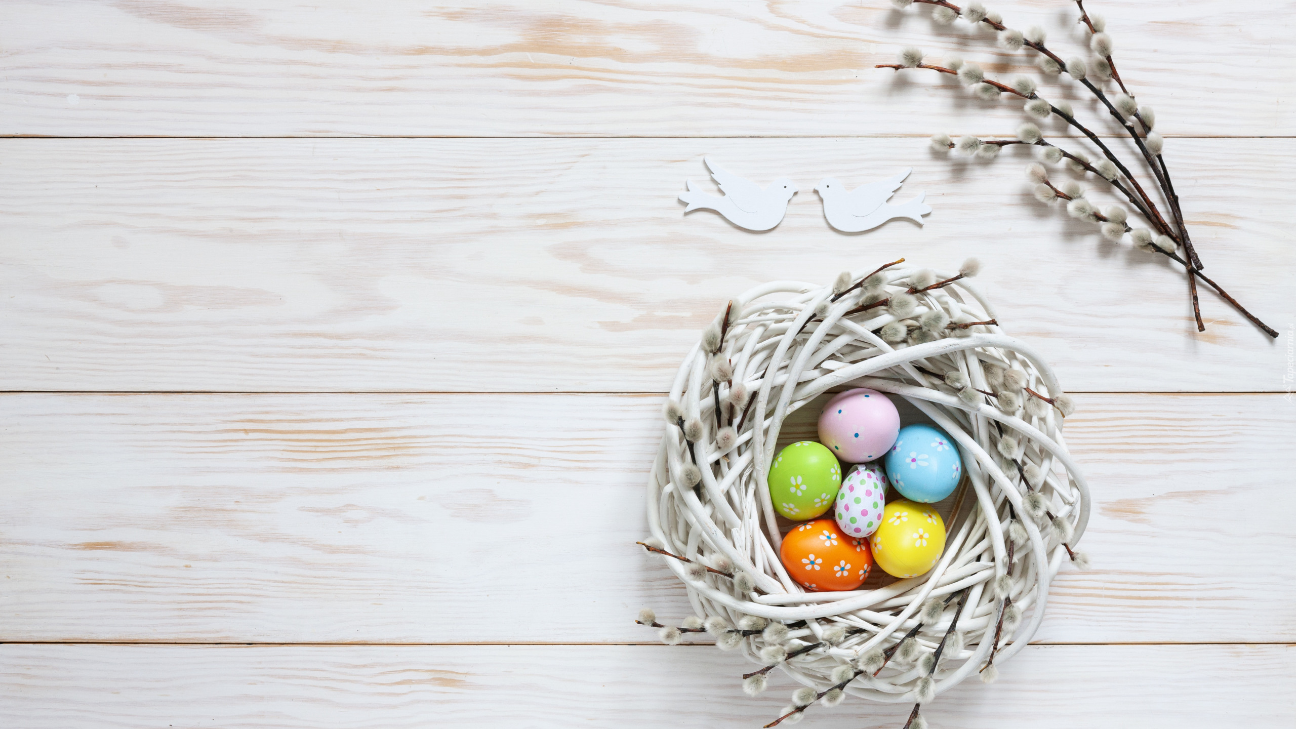 Edytor tapety: Ptaszki i bazie obok gniazda z pisankami