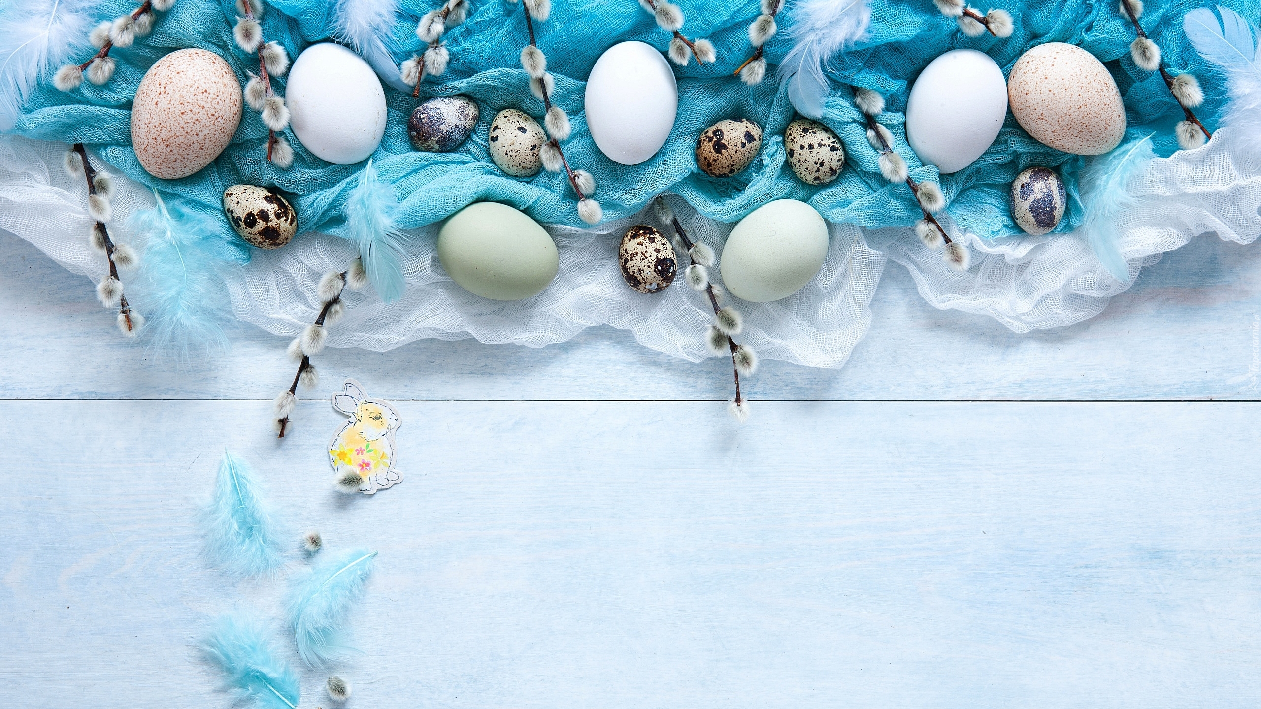 Edytor tapety: Jajka z baziami na niebieskim materiale