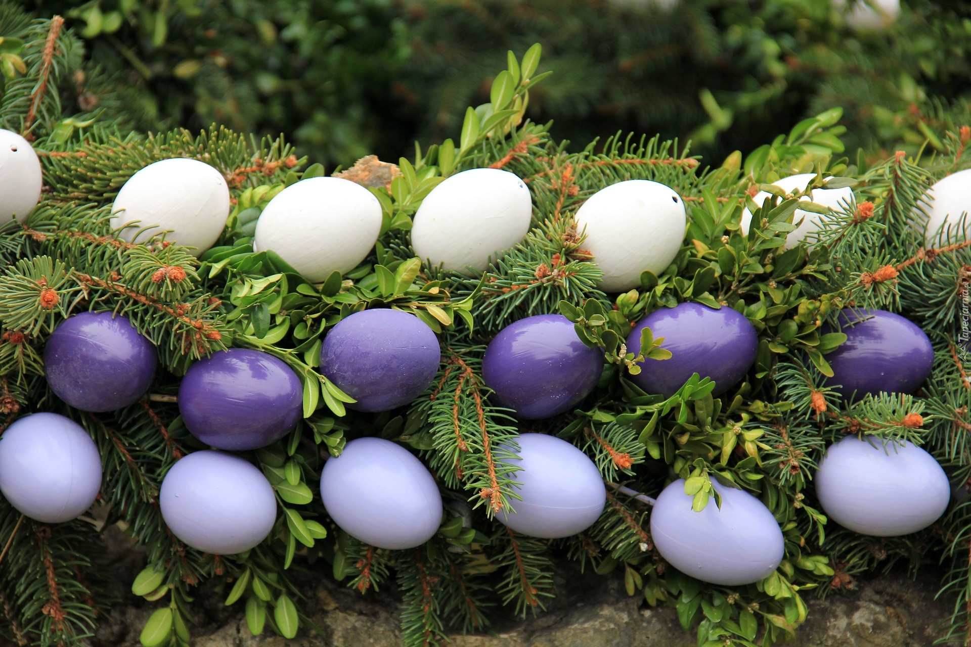 Edytor tapety: Białe i fioletowe pisanki pośród gałązek
