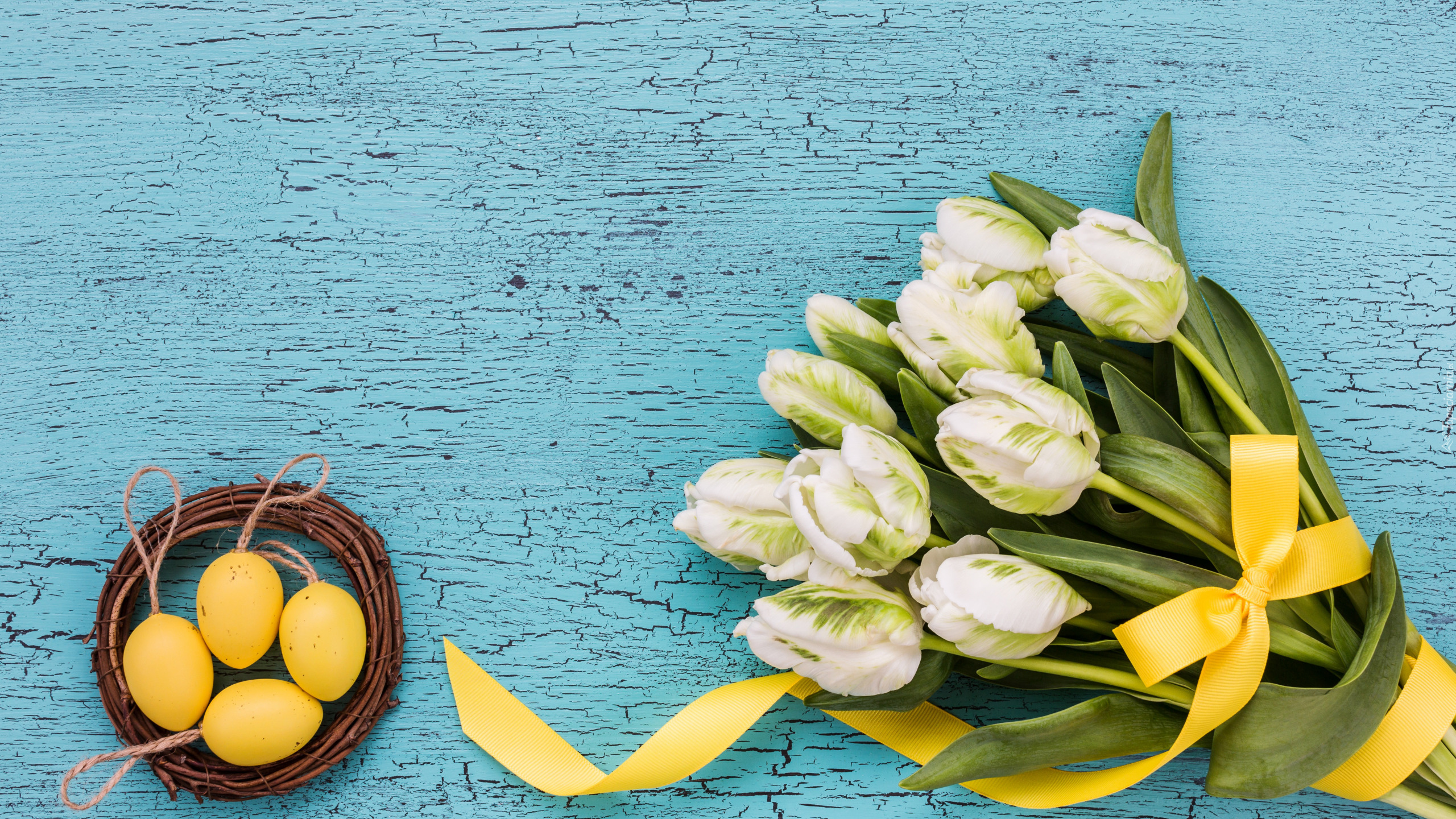 Edytor tapety: Bukiet papuzich tulipanów obok pisanek