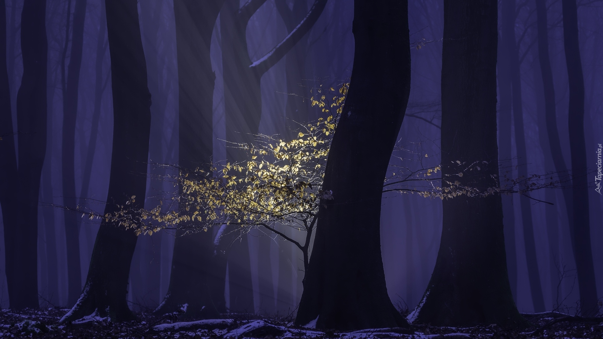 Edytor tapety: Rozświetlone drzewo w ciemnym lesie
