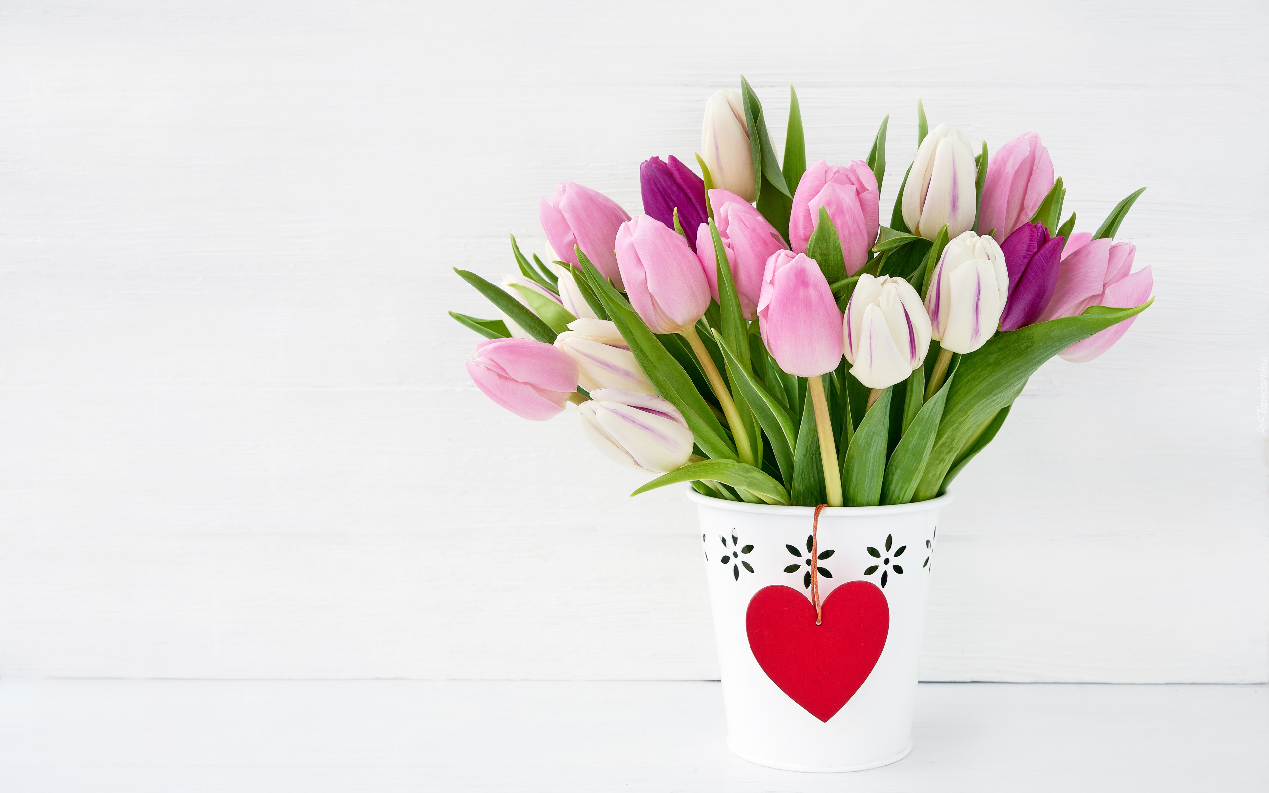 Edytor tapety: Różowe i białe tulipany w białej doniczce