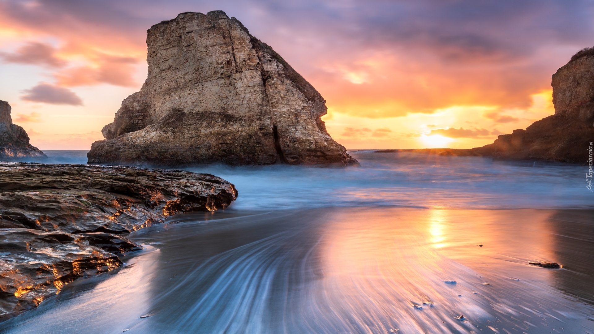 Edytor tapety: Skały w morzu o wschodzie słońca