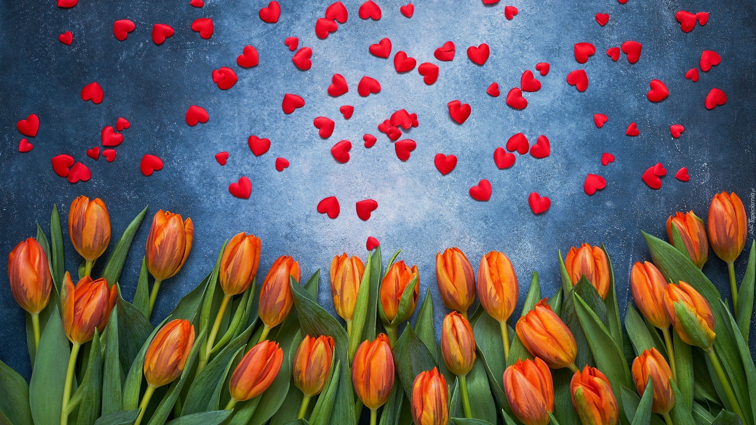 Edytor tapety: Serduszka nad pomarańczowymi tulipanami