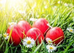 Edytor tapety: Pięć czerwonych pisanek w trawie