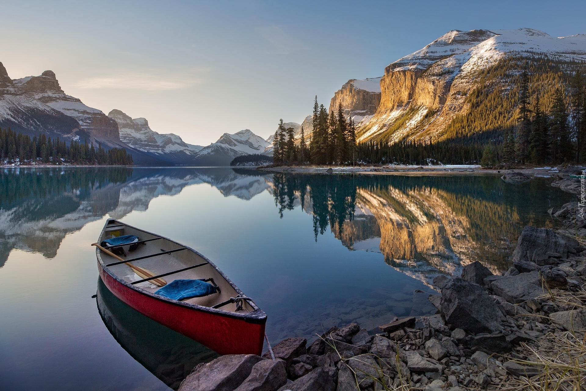 Edytor tapety: Kajak na brzegu jeziora Maligne w Kanadzie