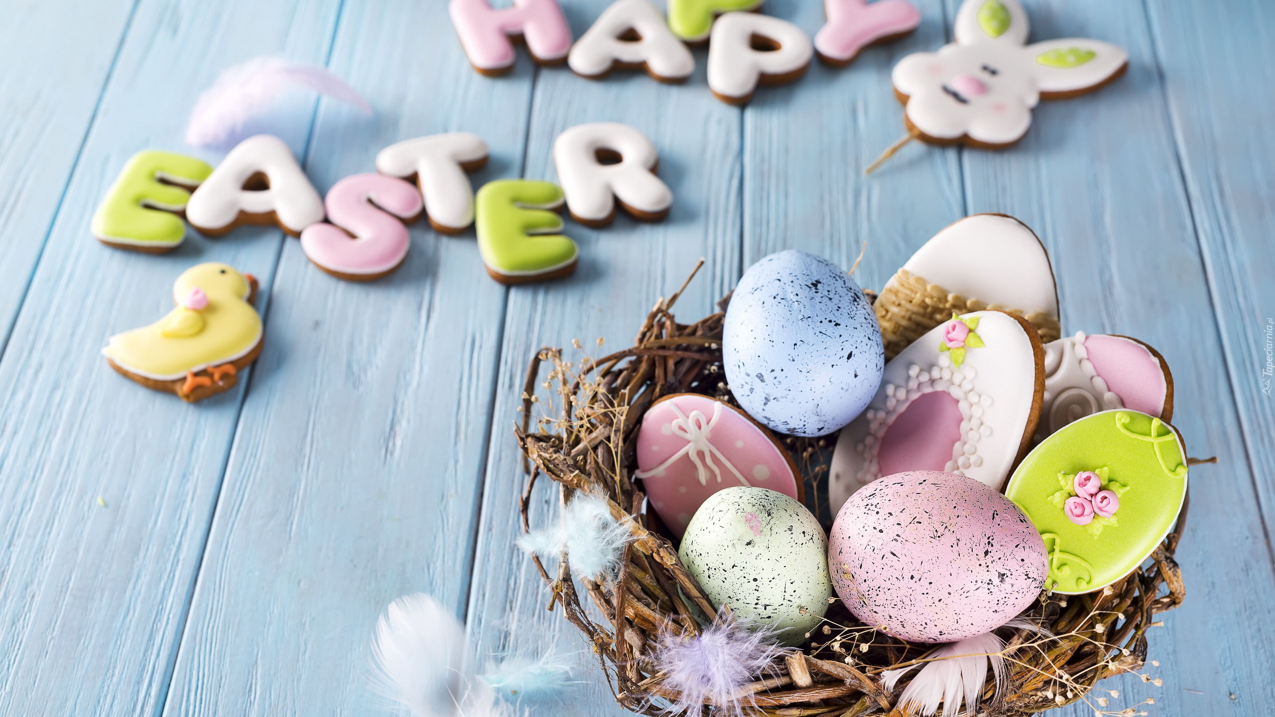 Edytor tapety: Ciasteczka z pisankami na niebieskich deskach