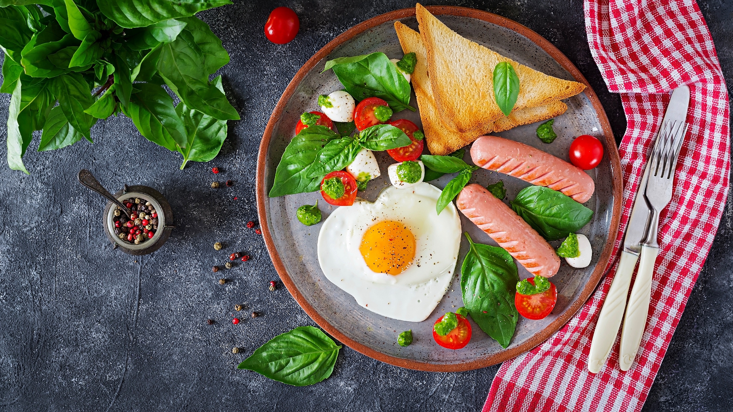 Edytor tapety: Jajko sadzone i parówki z dodatkami na śniadanie