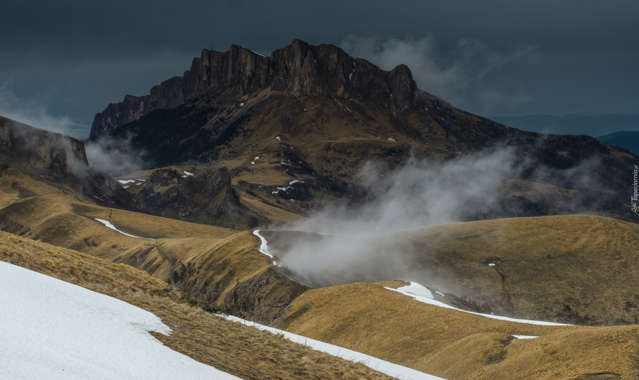 Edytor tapety: Opadająca mgła w górach