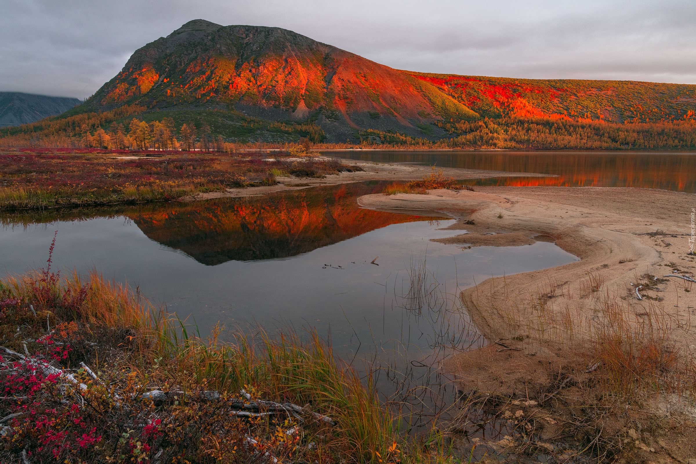 Edytor tapety: Góry rozświetlone zachodem słońca nad jeziorem Jack London