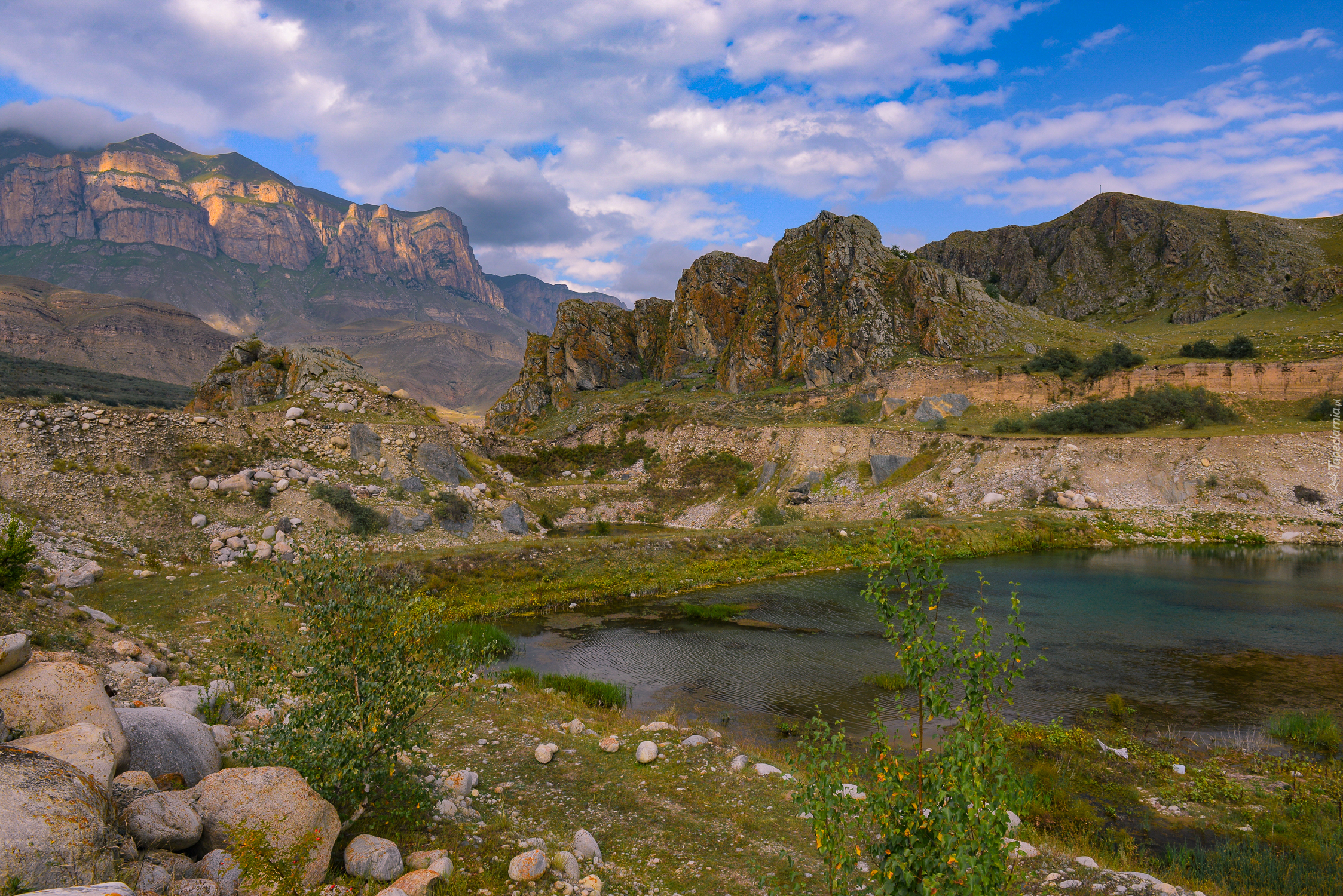 Edytor tapety: Jezioro otoczone skałami