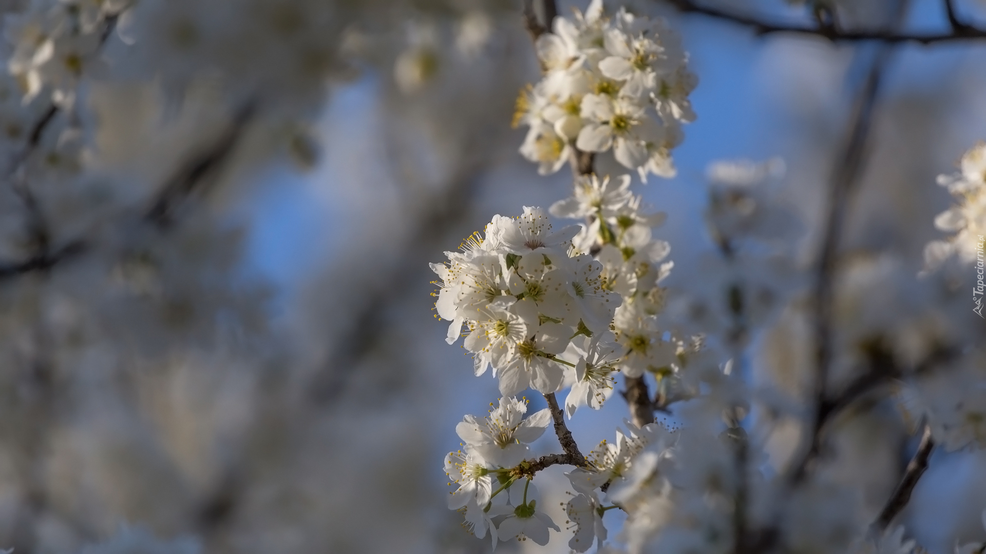 Edytor tapety: Gałązki drzewa owocowego z białymi kwiatkami