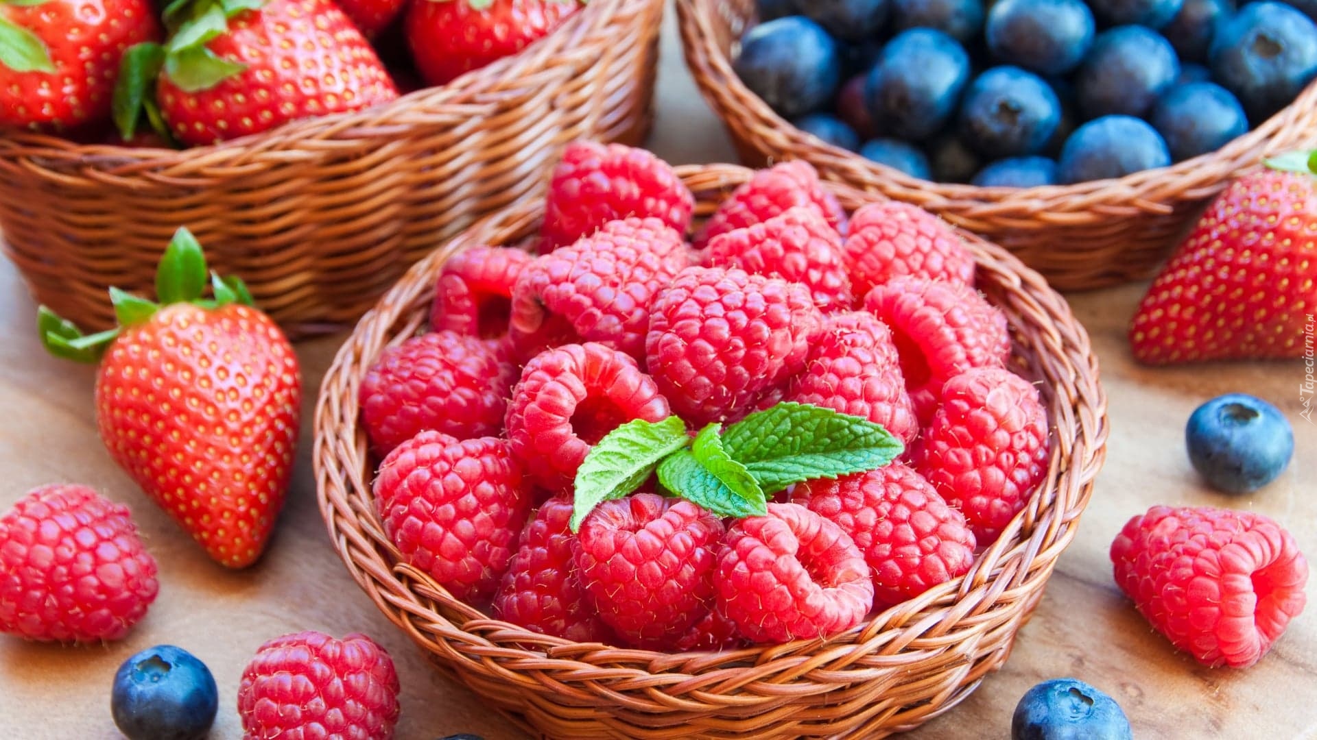 Edytor tapety: Maliny w koszyczku obok truskawek i jagód