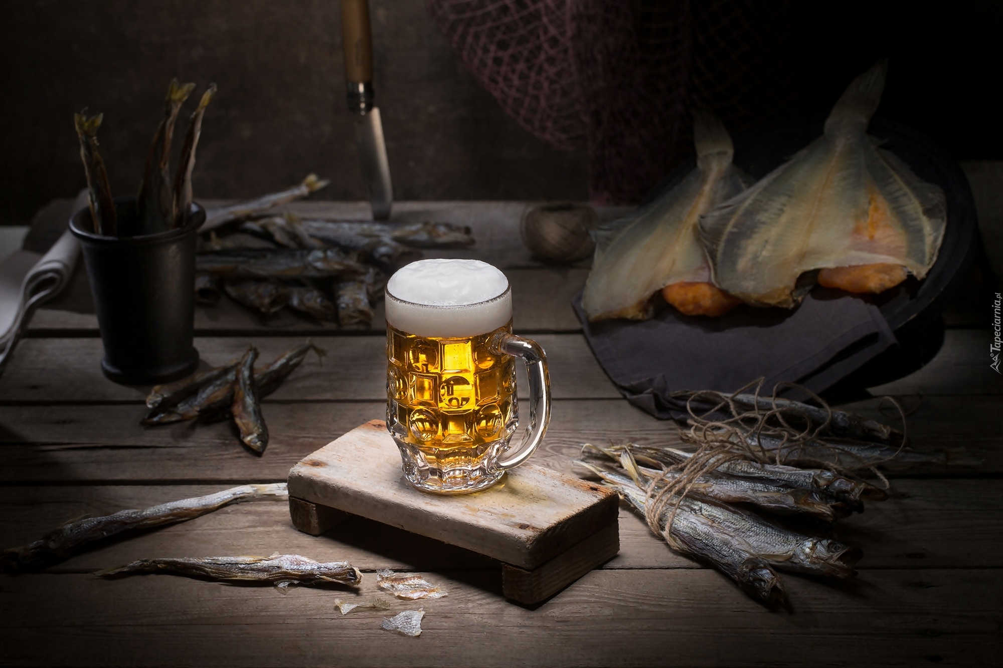 Edytor tapety: Kufel piwa obok ryb
