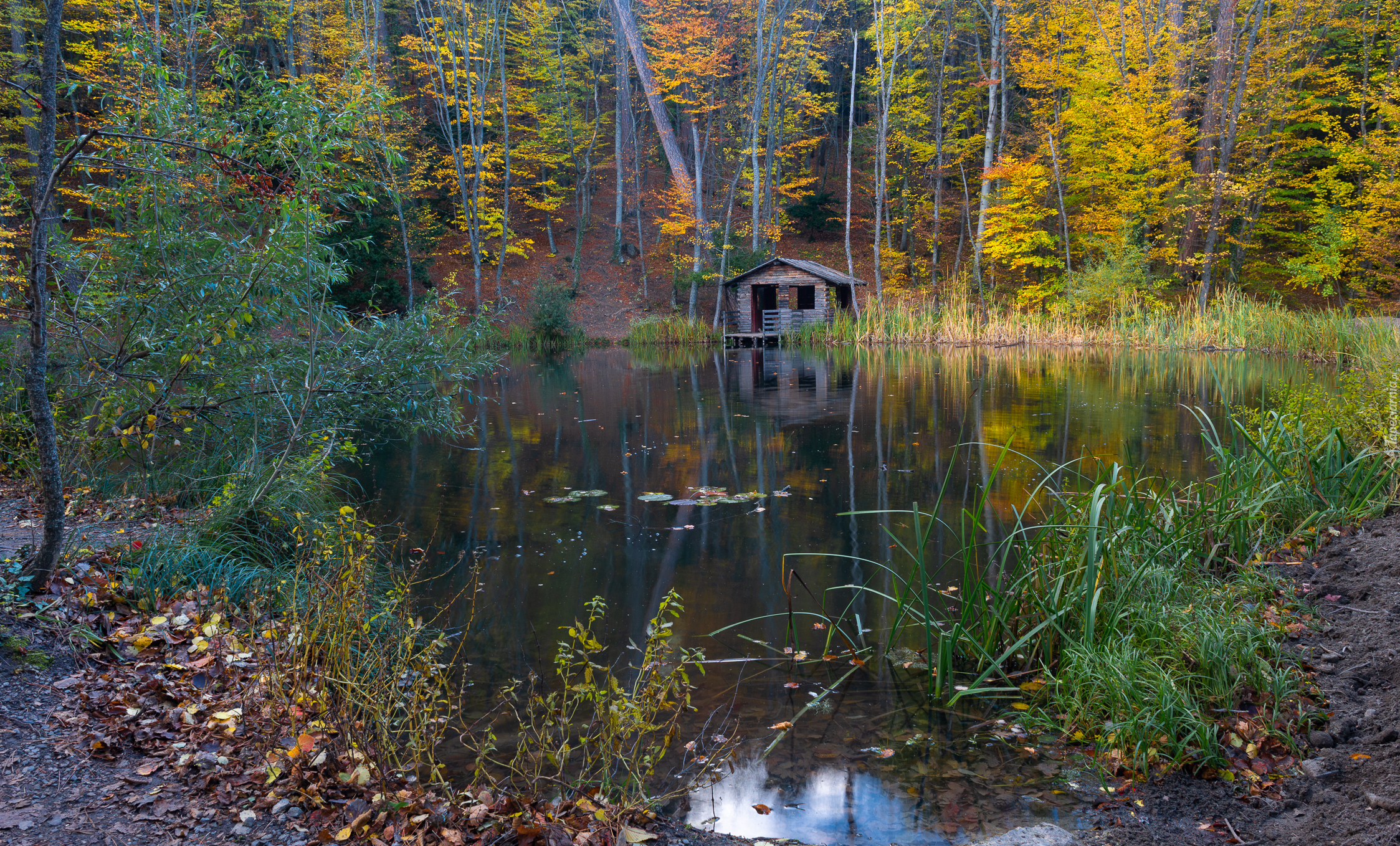 Edytor tapety: Drewniana altanka na brzegu jeziora w lesie