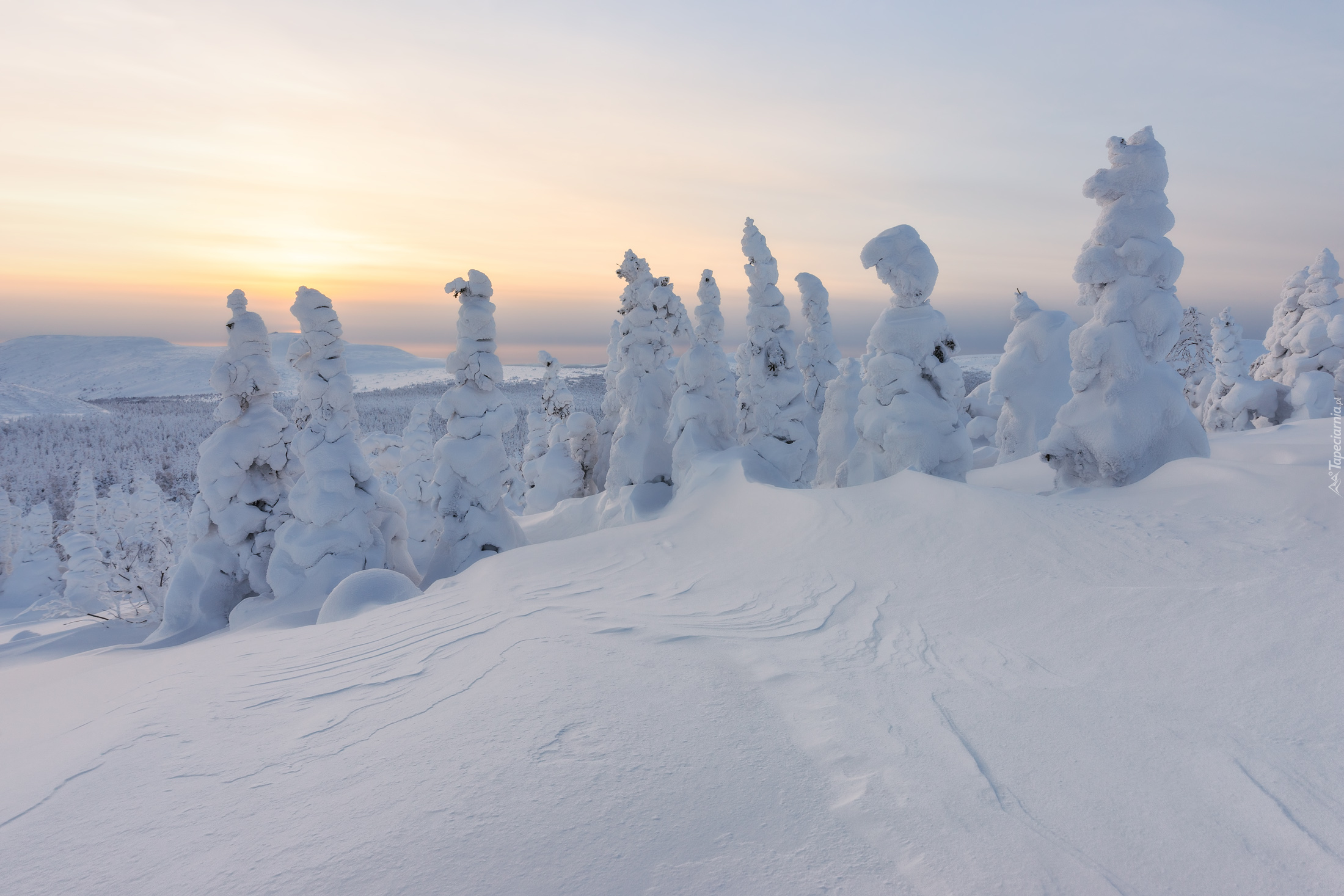 Edytor tapety: Drzewa w śniegu na wzgórzach