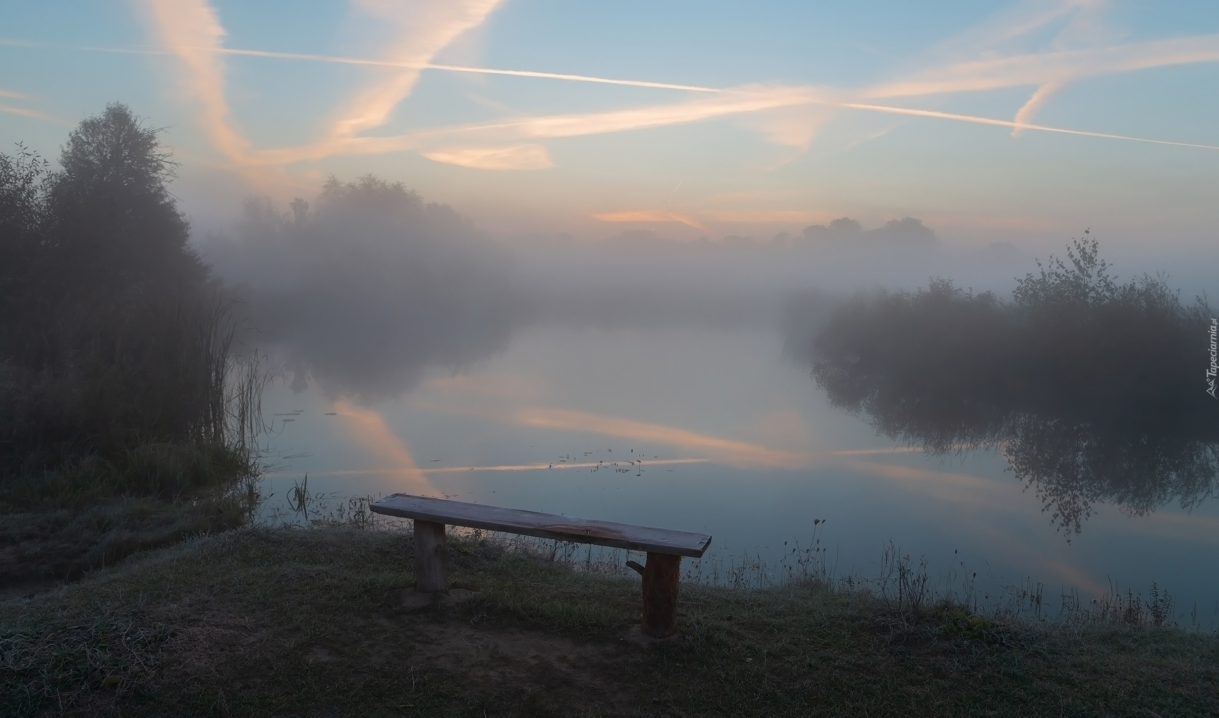 Edytor tapety: Ławka nad brzegiem zamglonego jeziora