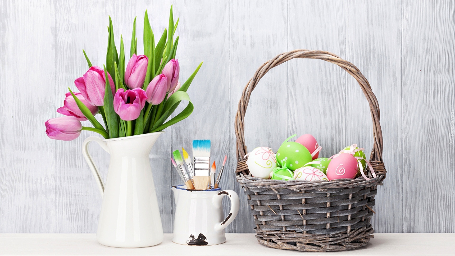 Edytor tapety: Tulipany w dzbanku obok koszyczka z pisankami