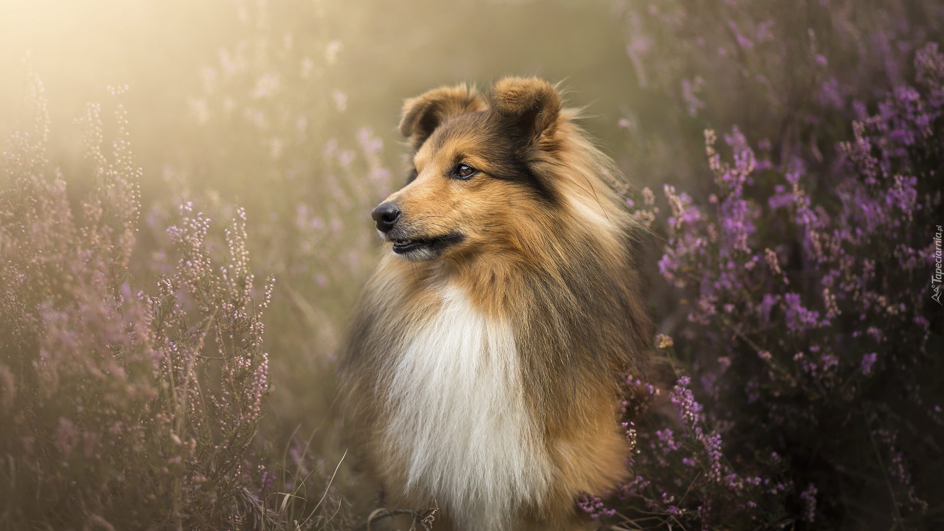 Edytor tapety: Owczarek szetlandzki obok wrzosu