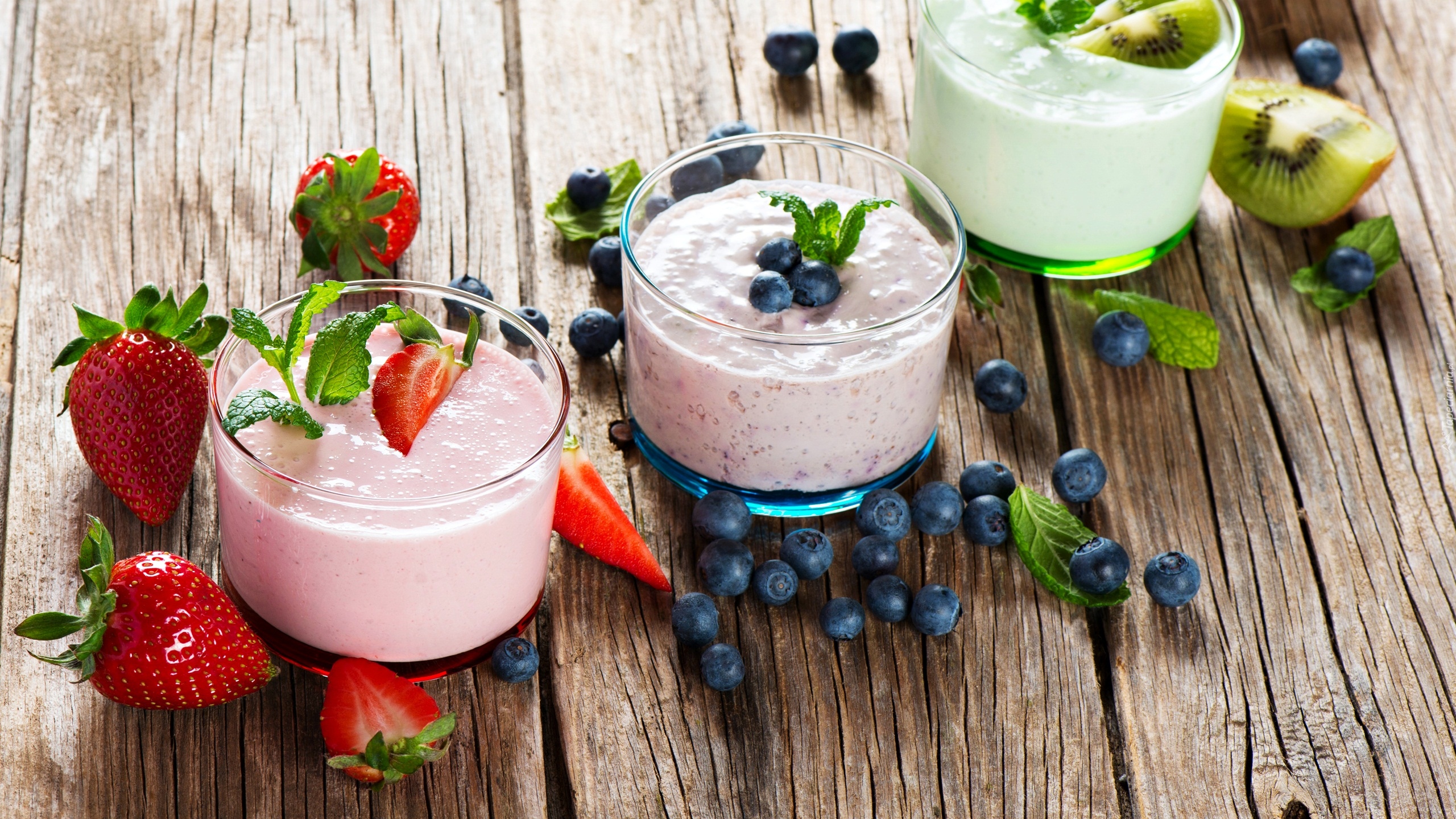 Edytor tapety: Trzy koktajle i owoce na deskach