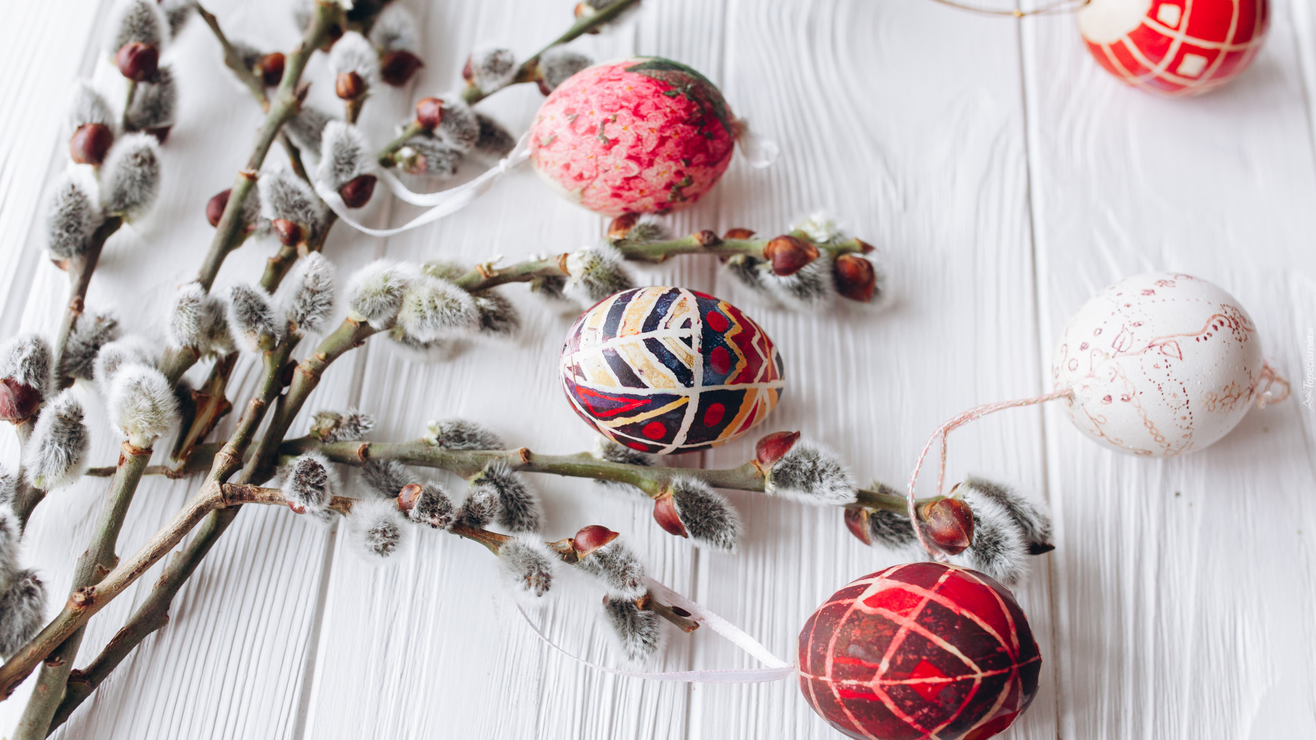 Edytor tapety: Bazie i kolorowe pisanki na deskach