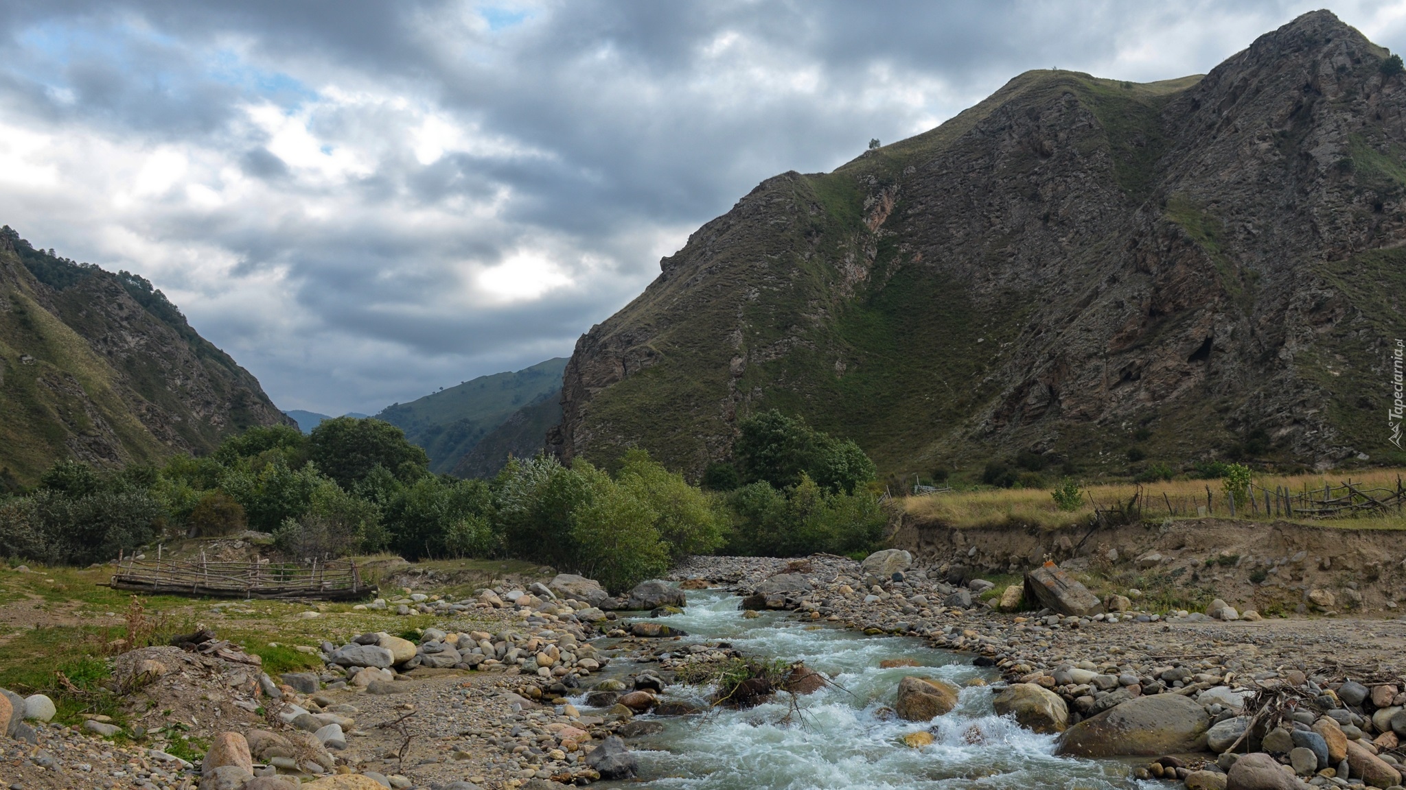 Edytor tapety: Drzewa nad kamienistym strumykiem w górach